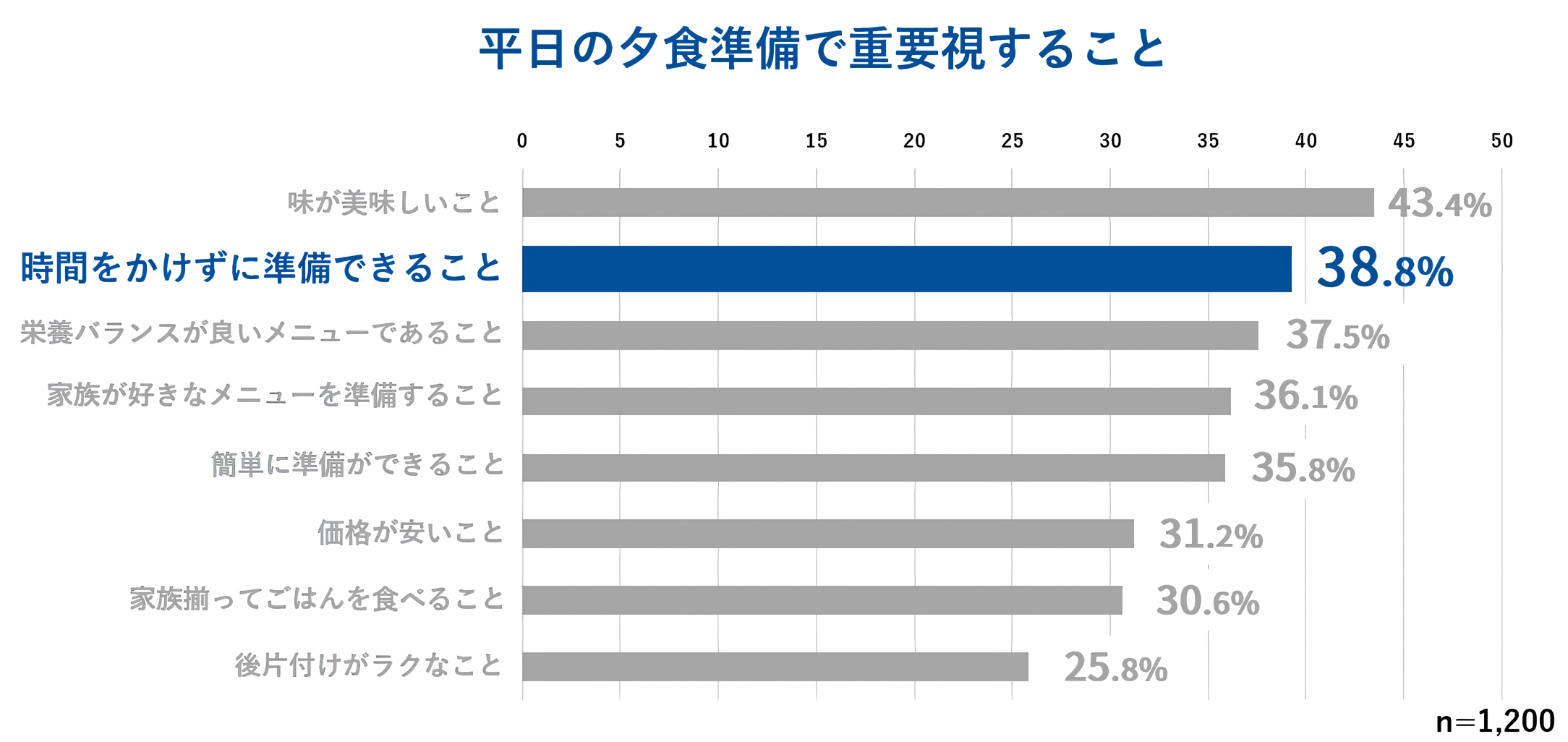 平日の夕食の食事準備において重要視していることは何か聞いたところ「味がおいしいこと」(43.4%)に次ぎ「時間をかけずに準備できること」(38.8%)という回答が多い結果となりました。