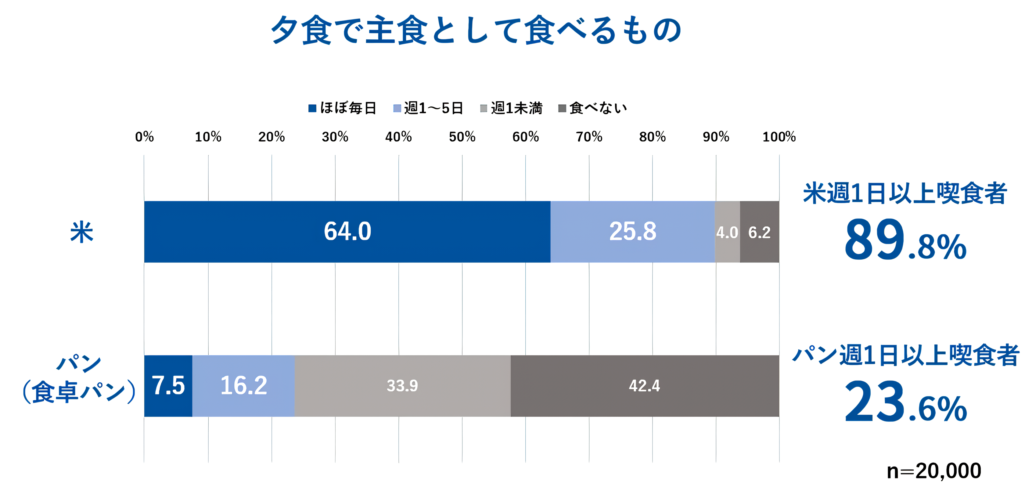 ・夕食に米を週に1日以上食べる人は約9割であったのに対し、パンを週に1日以上食べる人はわずか約2割