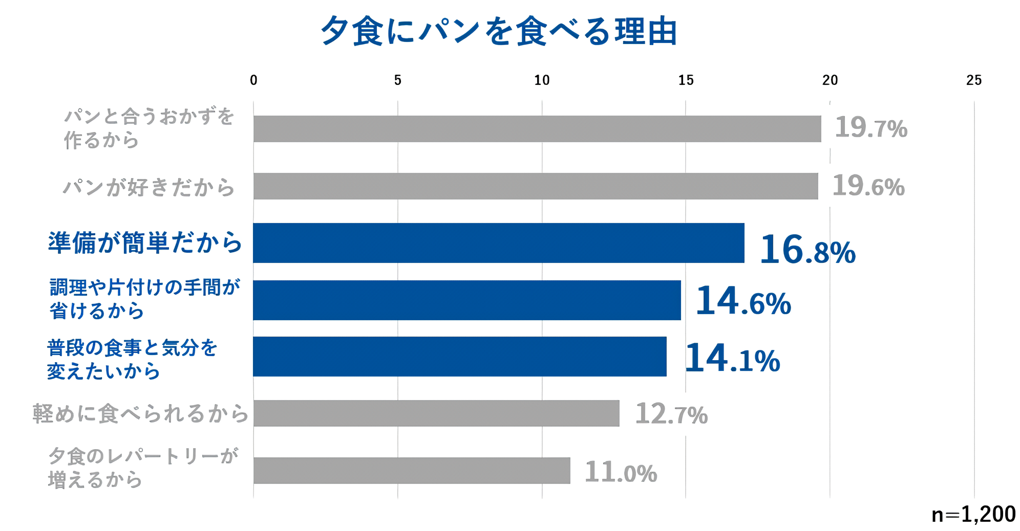 夕食時の主食として、パンを2~3か月に1日以上食べているという人に対し、平日の夕食にパン(食卓パン)を食べる理由を聞いたところ、 「パンと合うおかずをつくるから」 (19.7%)「パンが好きだから」(19.6%)に次いで、「準備が簡単だから」(16.8%)「調理や片付けの手間が省けるから」(14.6%)など、夕食にまつわる家事を簡単にできる点が挙げられました。また、 「普段の食事と気分を変えたいから」(14.1%)といった楽しさを理由にパンを食べている回答もみられました。