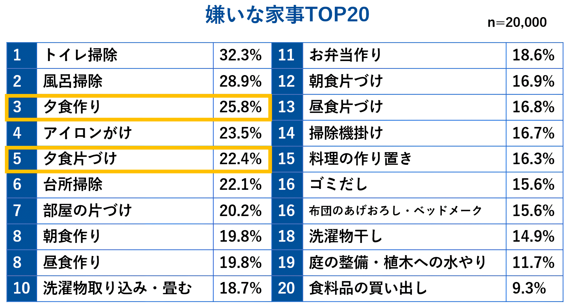 ・嫌いな家事TOP5に「夕食づくり」「夕食片付け」と、夕食にまつわる家事が2つもランクイン