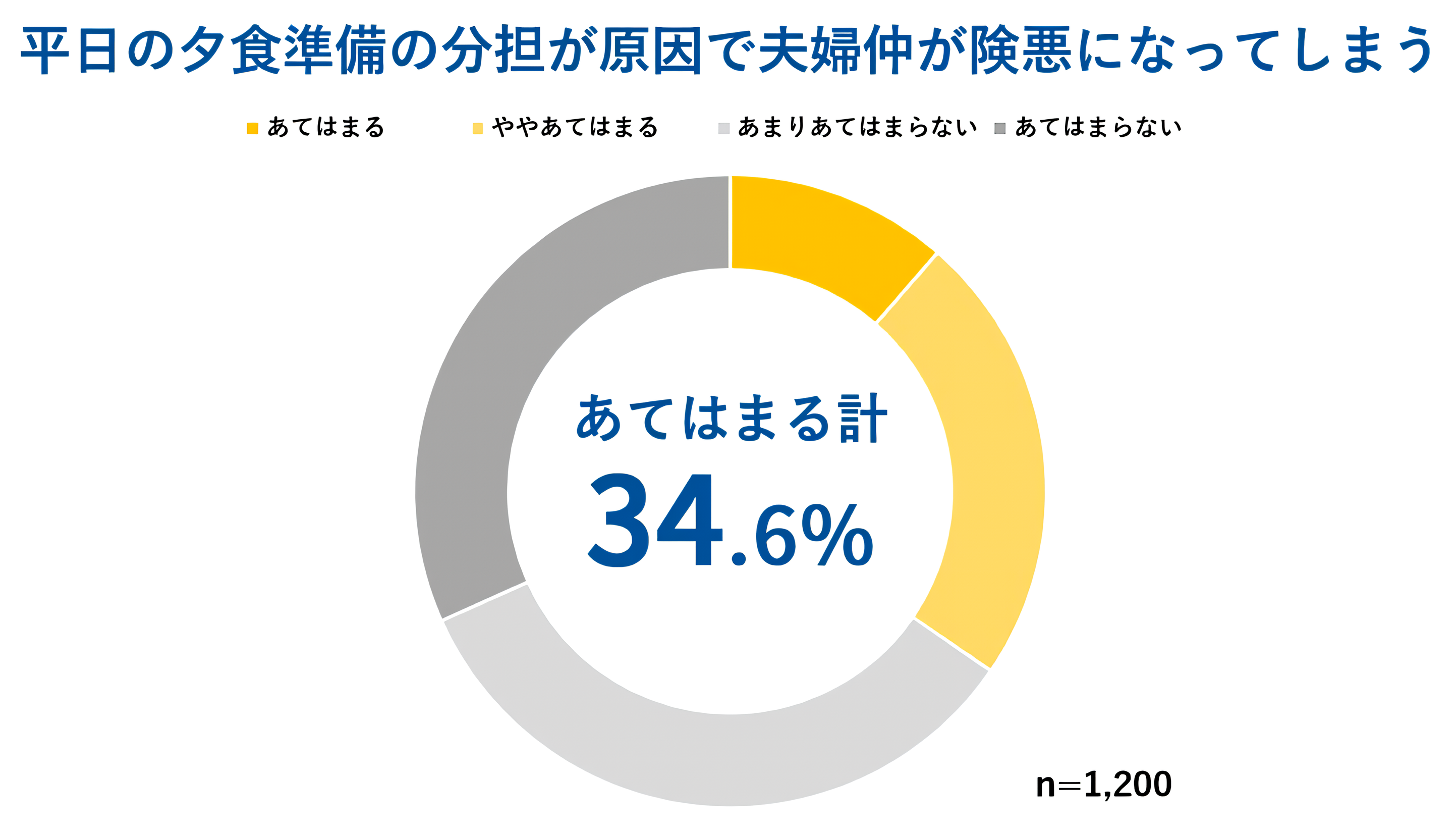 夫婦間の夕食準備の分担における困りごとについて、「夕食準備の分担が原因で夫婦仲が険悪になってしまうか」という問いに「あてはまる」、「ややあてはまる」と回答した人が34.6%にのぼり、夕食の分担が原因で、約3割の夫婦が険悪になっていることが明らかになりました。