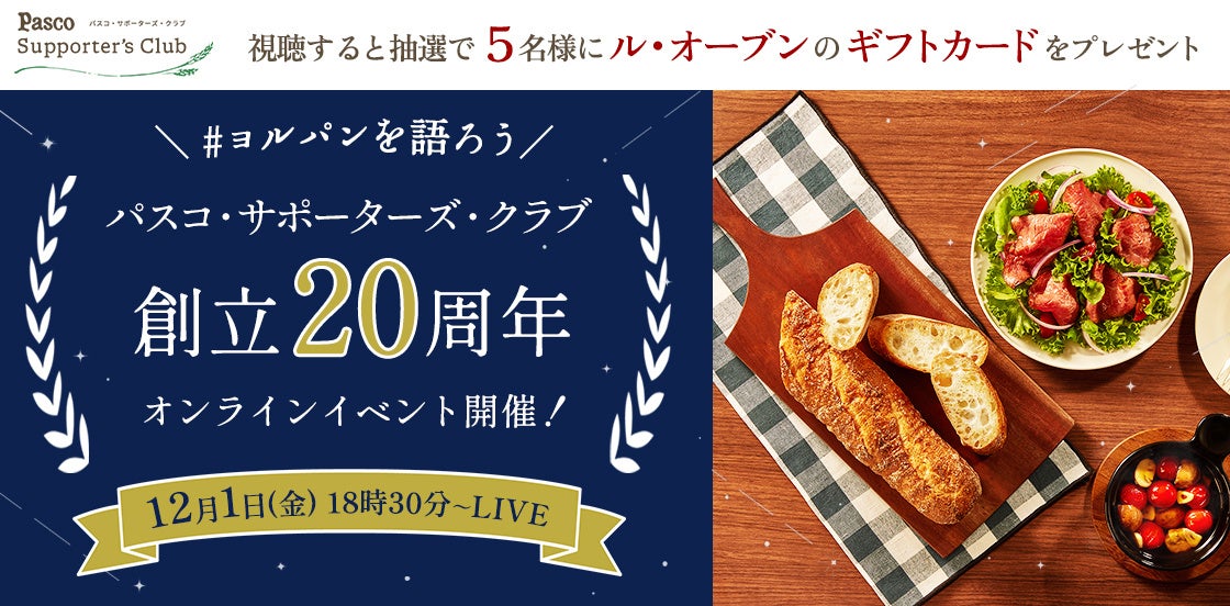Pascoとパン好きのみなさまがつながるコミュニティ「パスコ・サポーターズ・クラブ」は、今年で創立20周年を迎えました。これを記念し、ヨルパンをテーマとしたオンラインイベントを開催いたします。