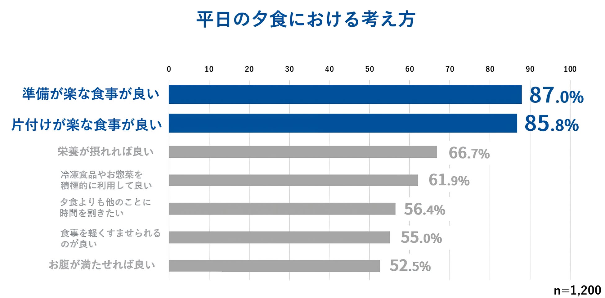 また、平日の夕食における考え方について聞いたところ、「準備が楽な食事がいい」(87.0%)「片付けが楽な食事がいい」(85.8%)という回答が多く挙げられました。