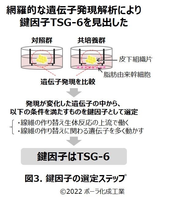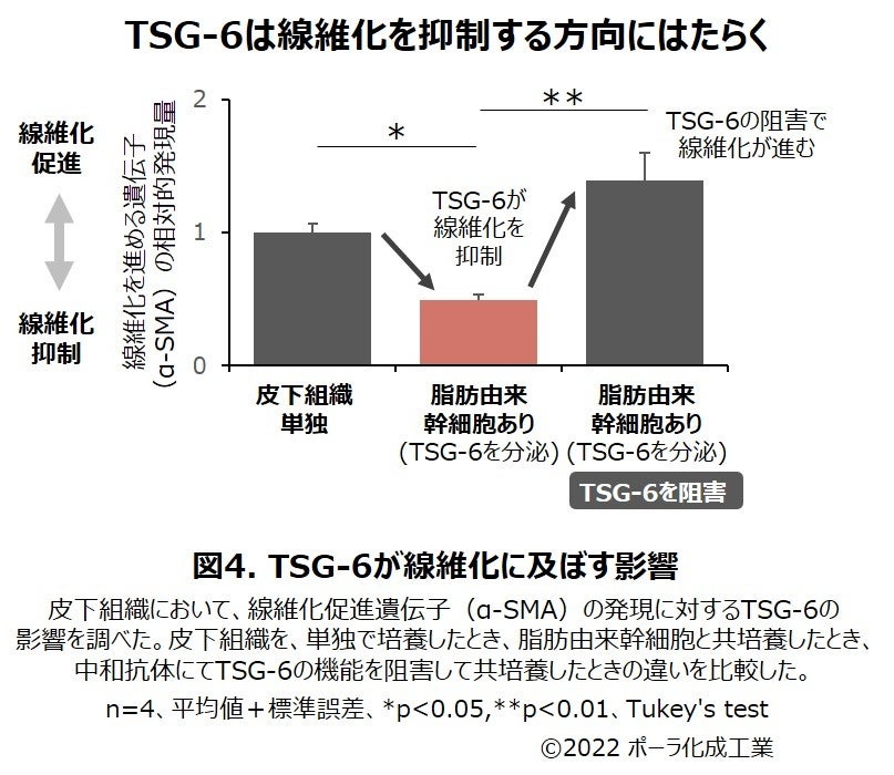 そこで、新鮮な皮下組織片を用いた実験系で、再生医療後に起こる生体反応を解明することで、線維の作り替えを起こす鍵となる生体因子を見つけ出すことにしました。その結果、脂肪由来幹細胞から分泌されるTSG-6という生体因子が、組織の炎症状態を改善することで、線維化※2を抑制し、かつ線維の作り替えを促すことを発見しました(図1、補足資料1)。つまり、TSG-6が線維の作り替えを引き起こす鍵として働いていたのです。