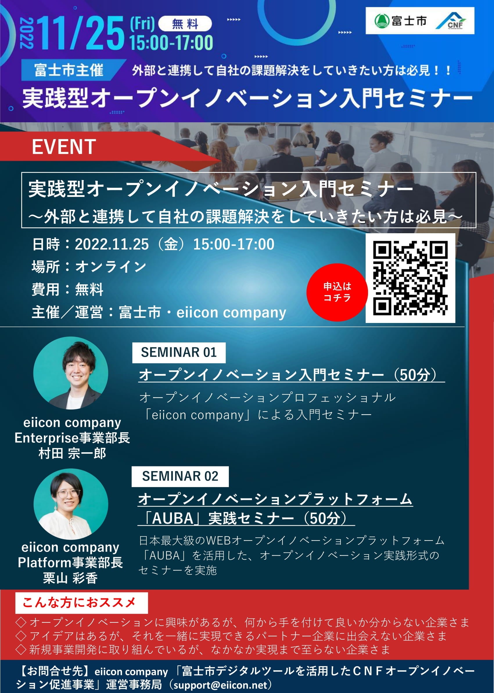 | 「実践型オープンイノベーション入門セミナー」 日時:2022年11月25日(金)15:00~17:00 会場:(オンライン開催) 参加対象:「富士市CNFプラットフォーム」会員・その他関連企業 ※ ※未加入の方もご参加いただけます。 参加費:無料(先着順) 主催: 富士市、eiicon company 申込方法: https://forms.gle/sBsJrtHn91f5rUQz7 |