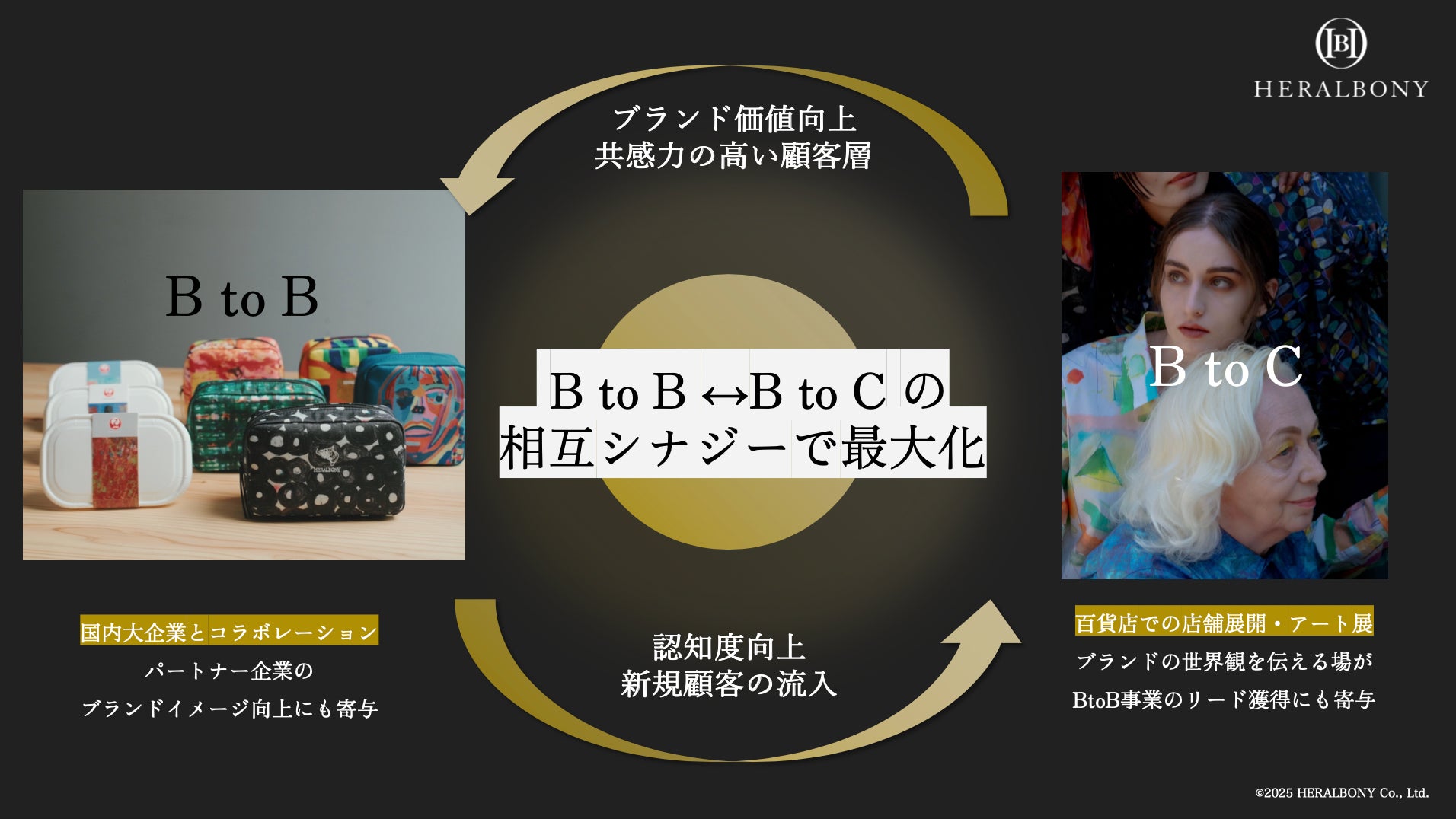 BtoCの個人向け事業では、自社ブランド「HERALBONY」を通じて多様な媒体でのブランド露出を高めるとともに、作品IPを活かした質の高いプロダクトの提供により、顧客基盤を急速に拡大しています。SNSでは累計フォロワー数が20万人を超え、さらに拡大を続けています。また、障害のある作家の国際的なアートアワード「HERALBONY Art Prize」をひとつの象徴的な場として、アートの鑑賞体験や作家のストーリーとの出会いを通じて価値観を変容させるほどの深い顧客体験を提供することにより、他社にはない強固な顧客ロイヤリティを実現しています。この強固な顧客基盤はBtoBの法人企業向けの事業に大きく活かされており、高い顧客ロイヤリティを背景に、企業とのコラボレーションがさらなるブランド認知と新規ファン獲得を促進しています。結果として、事業間でのシナジーが全体として事業成長を加速させています。