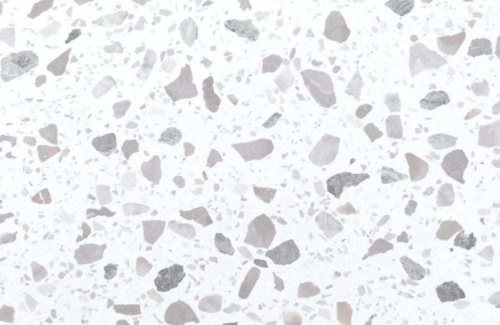 テラゾー柄は、砕いた自然石やガラスなどを樹脂やセメントで固めた、ランダムな模様が特徴のデザインです。イタリア語で「テラッゾ」と呼ばれるこの建材は、19世紀のイタリアで大理石の破片をセメントに混ぜ、テラスに敷き詰めて楽しんだのが始まりです。