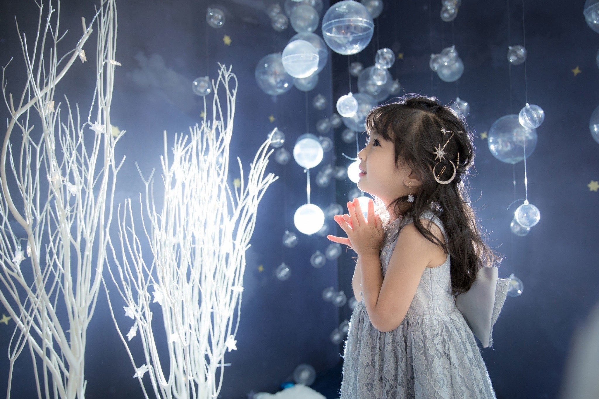 光る星の木を抜けて、雨のトンネルをくぐり抜けていきます。キラキラひかる雨粒が綺麗です!今回の撮影はグレーのレースドレスにお月様とお星様のアクセサリーをチョイスしました。