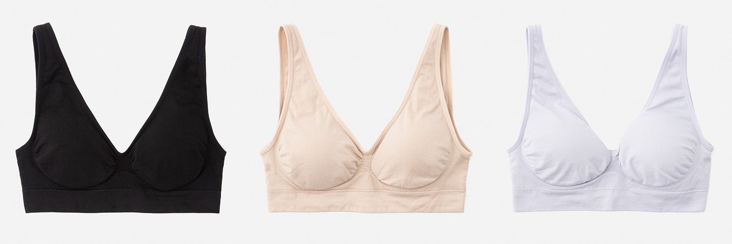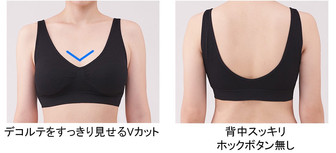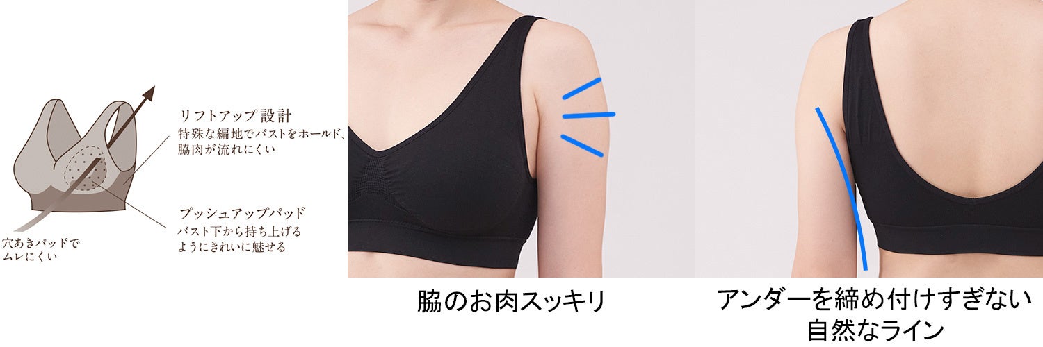 脇に肉が流れないようにサポートするリフトアップ設計で、広がりを抑えてスッキリとしたシルエットを叶えます。さらに、アンダーがきつい、背中が段になってしまいTシャツにひびいてしまうというようなよくあるお悩みにも対応。ホックのないタイプなので、簡単に着用いただけます。また、スポーティーになりすぎないようカットラインにこだわることで上品で大人らしい印象に。素材にもこだわり、優しい着用感なのにきれいにきちんと見せてくれるのが嬉しいポイントです。
