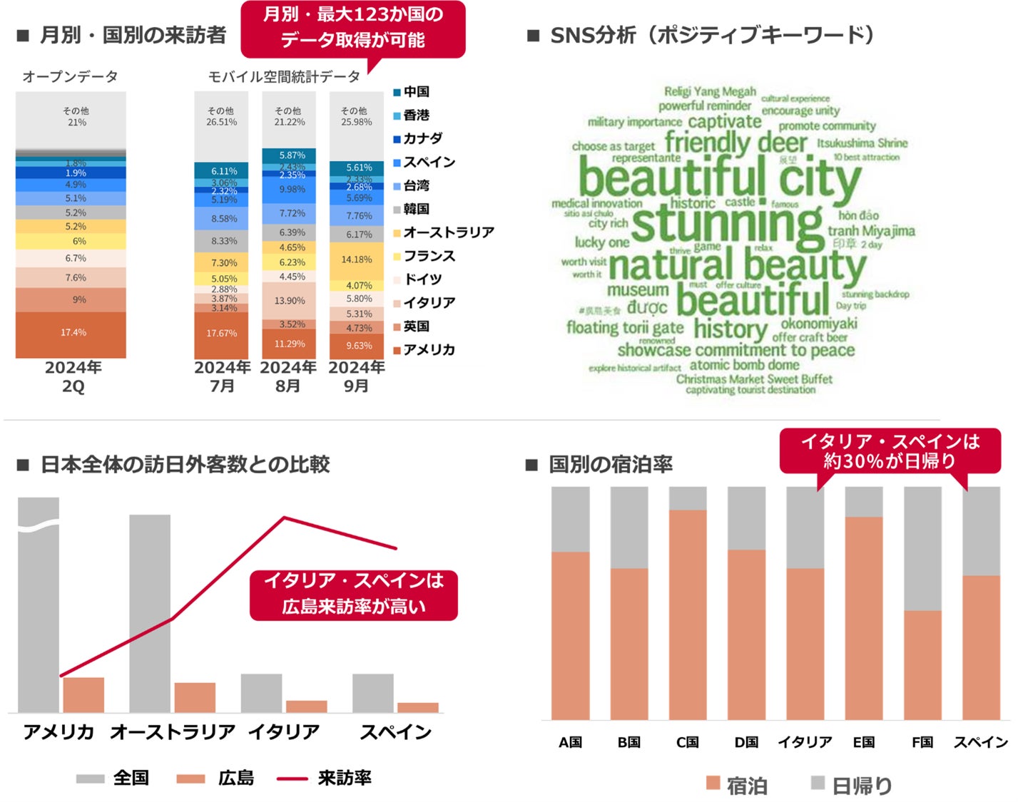 テクノロジーで企業と社会の進化を実現する株式会社電通総研(本社:東京都港区、代表取締役社長:岩本 浩久、以下「電通総研」)、一般社団法人広島県観光連盟(以下「HIT」)、学校法人早稲田大学(以下「早大」)、 NTTコミュニケーションズ株式会社(以下「NTT Com」)、株式会社インテージ(以下「インテージ」)は、データを活用した観光マーケティングの実証実験(以下「本実証」)を2025年3月より広島県で実施しており、先行してインバウンド観光客の動態把握を行いました。その結果、誘客と消費促進に向けた施策立案へのデータ利活用の有効性を確認できたため、2025年6月より国内観光客を対象とした取り組みに展開します。