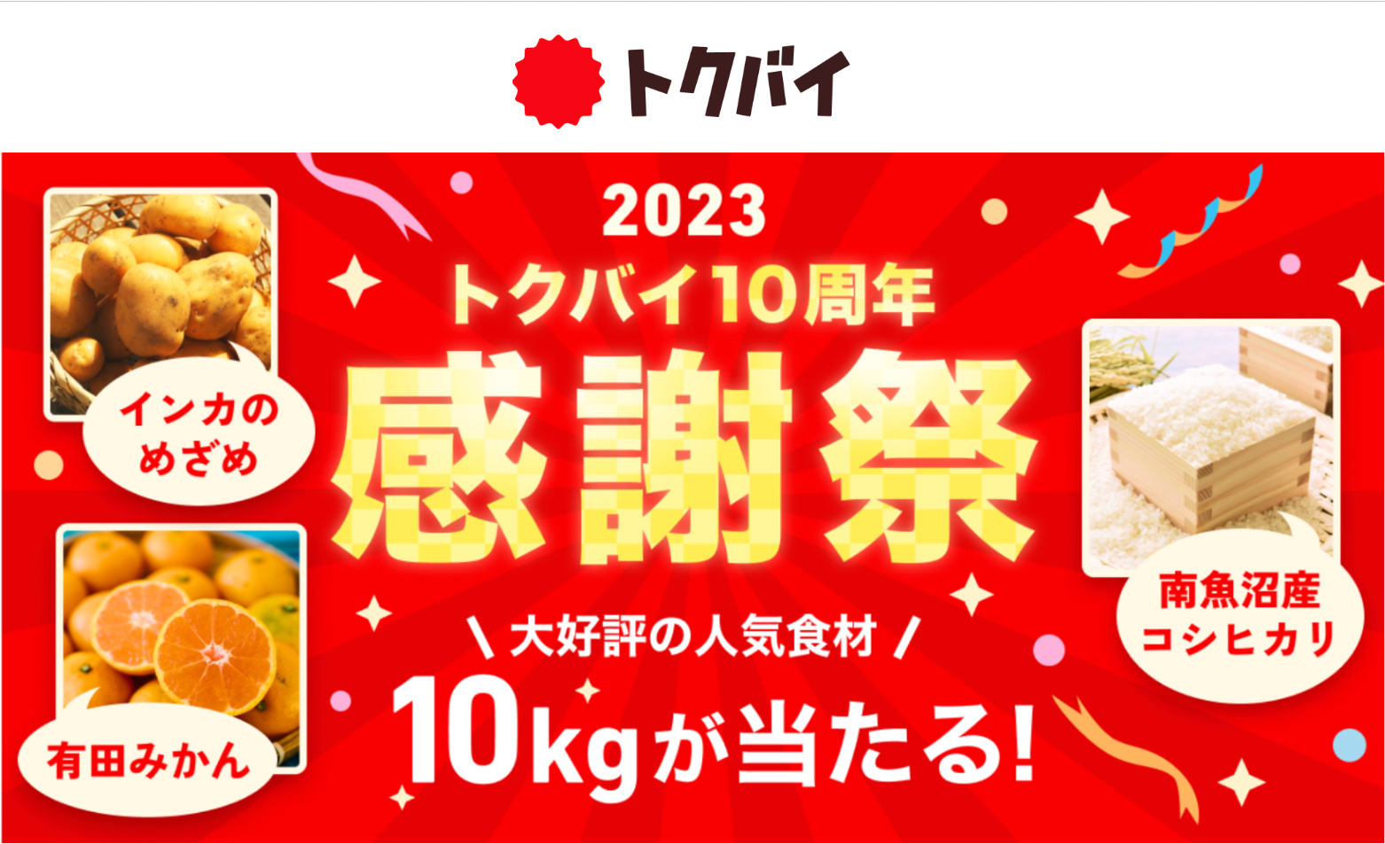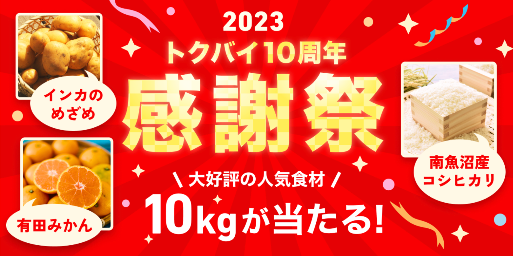 2023年2月に10周年を迎えたトクバイ。10年間を支えてくださったユーザーの皆さまへの感謝を込めて、10周年イヤーを締めくくるキャンペーンを開催します。「トクバイ」アプリをダウンロードし、キャンペーンにご応募いただいた方の中から抽選で合計30名様に、前回特に人気だった「南魚沼産コシヒカリ 10kg」「有田みかん 10kg」「インカのめざめ 10kg」いずれかをプレゼントします。