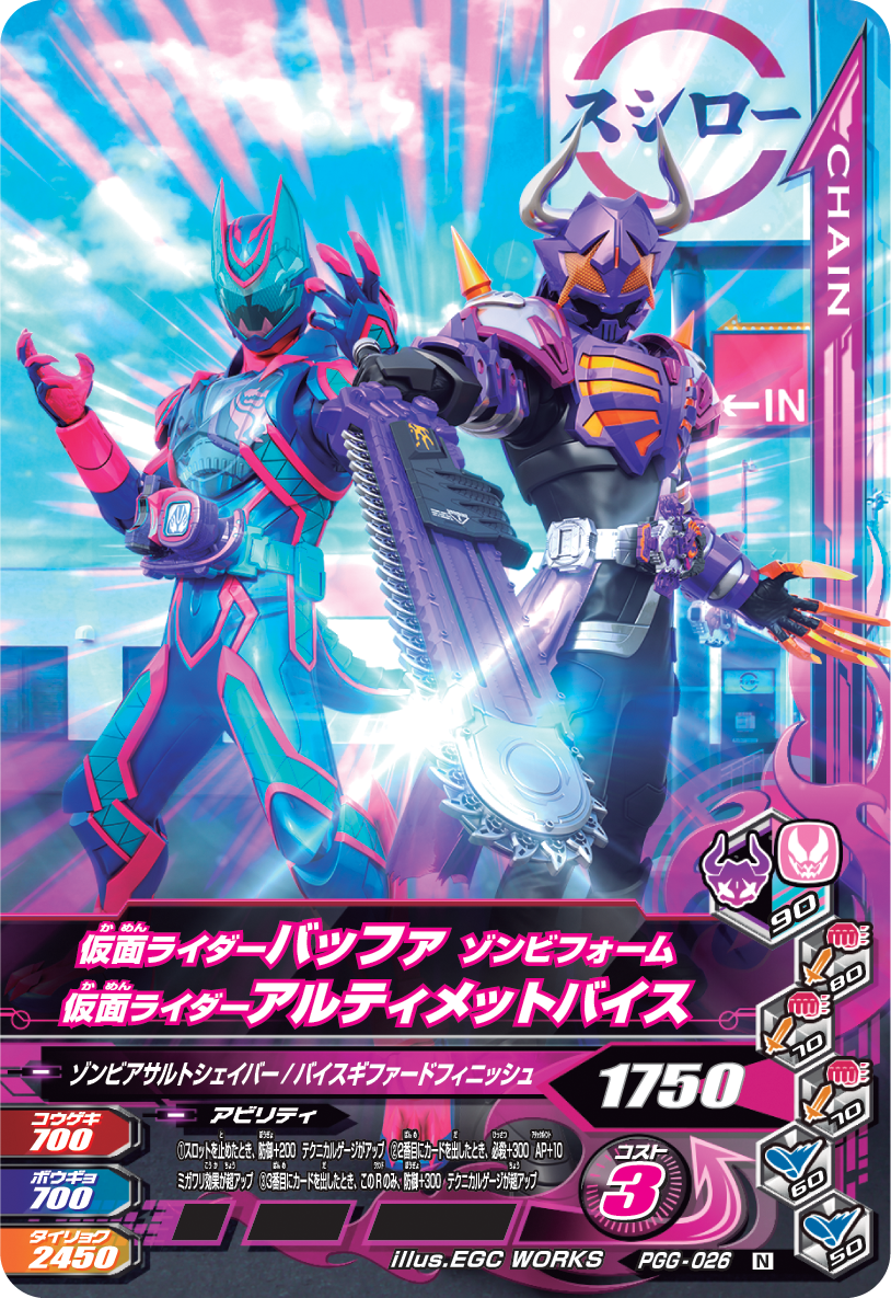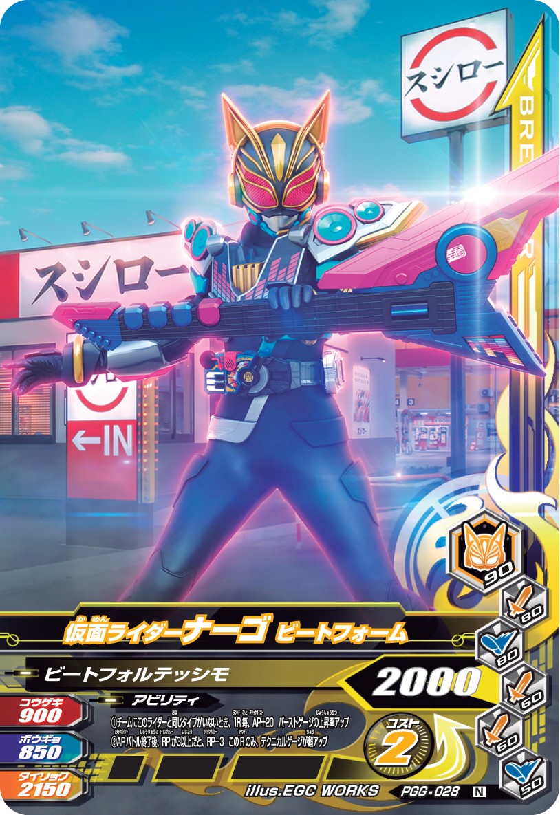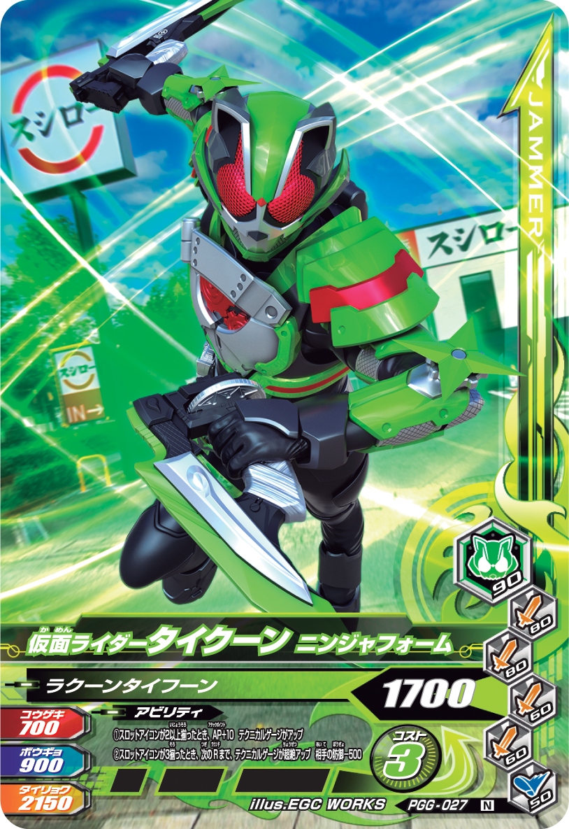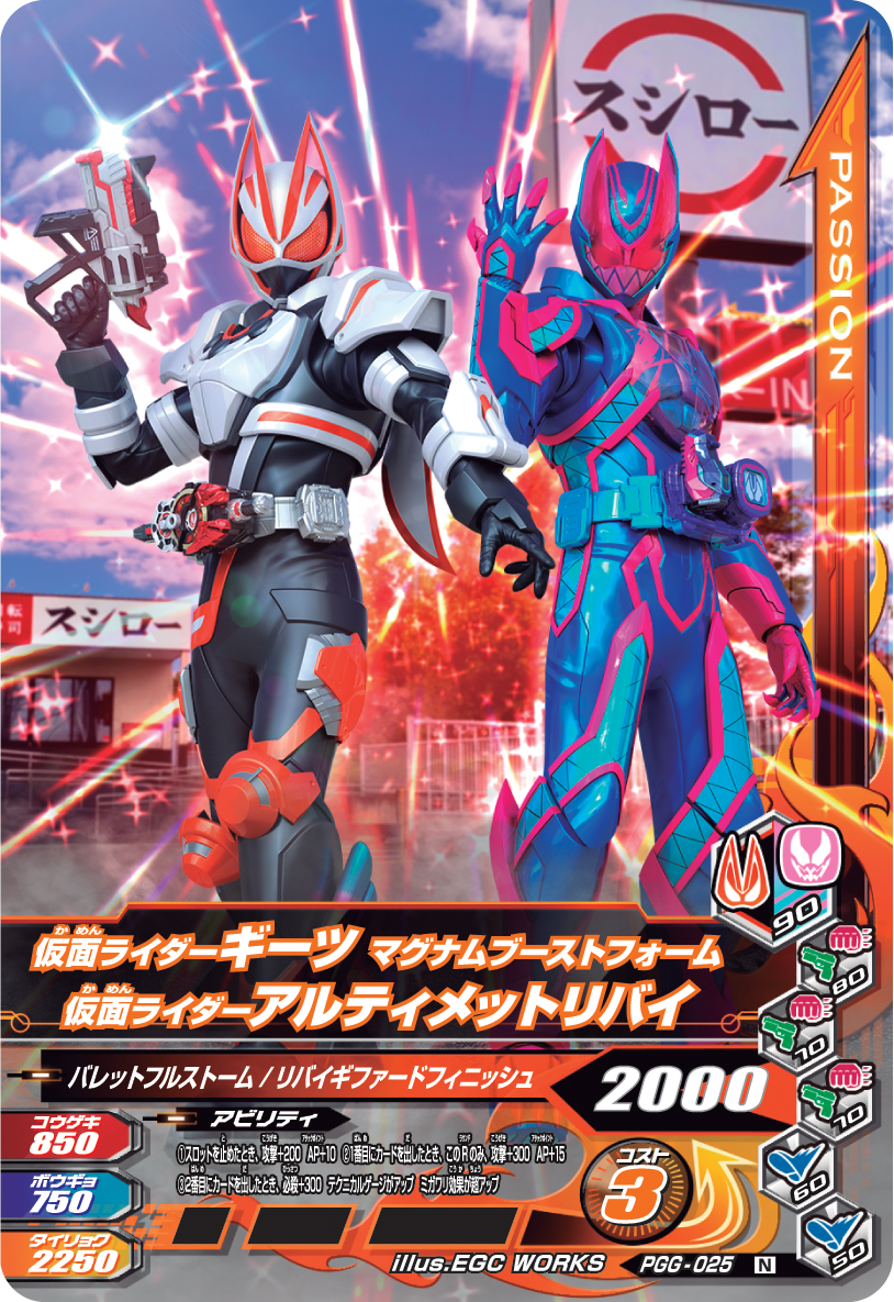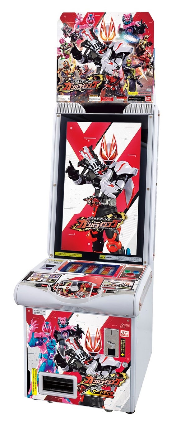 東映株式会社の監修によるオリジナルの世界観と壮大な物語をベースに、ライダーバトルが展開されると共に、今まで競演したことの無かった仮面ライダーたちがチームを組み、世代を超えて戦うドリームマッチを実現したデジタルカードキッズ筐体です。全国の量販店、アミューズメントコーナーに設置されている「データ カードダス 仮面ライダーバトル ガンバライジング」で遊べます。