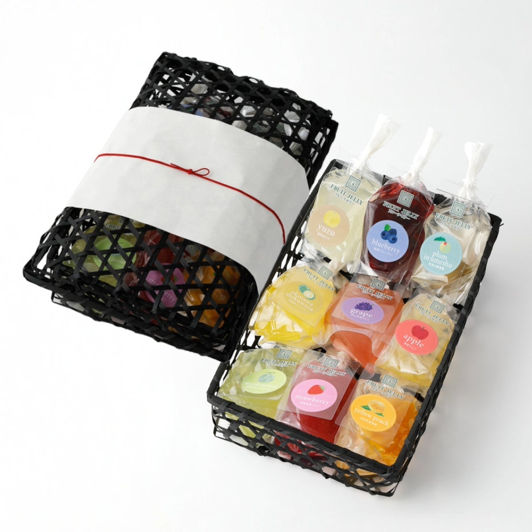 フルーツゼリー 藤野産ゆず、ブルーベリー、曽我の梅酒梅、沖縄県産シークヮーサー、岡山県産ぶどう、国産りんご、岡県産マスクメロン、宮城県産いちご、山形県産黄桃 各170g