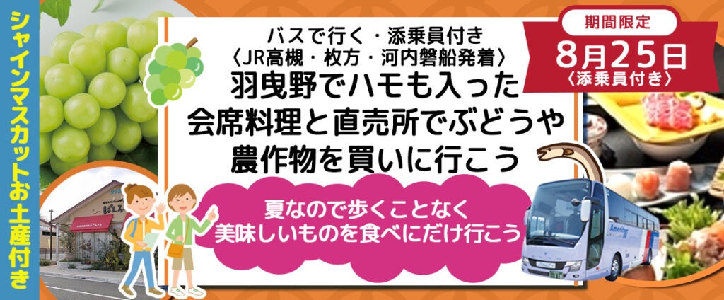 8月25日(金) 限定 お一人様¥7,800-〈JR高槻・枚方・河内磐船発着・添乗員付きバスで行く〉 羽曳野でハモも入った会席料理と河内ワインで試飲と農作物を買いに行こう シャインマスカットお土産付き!