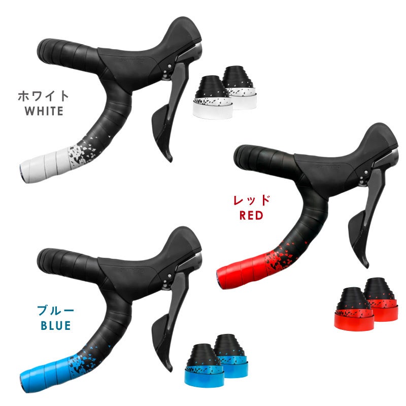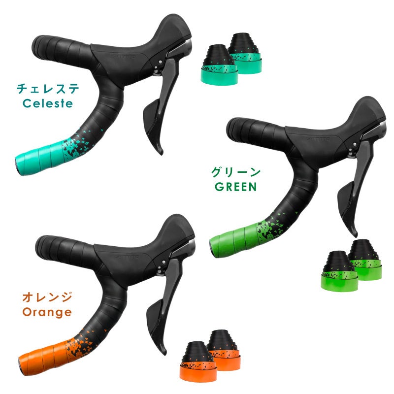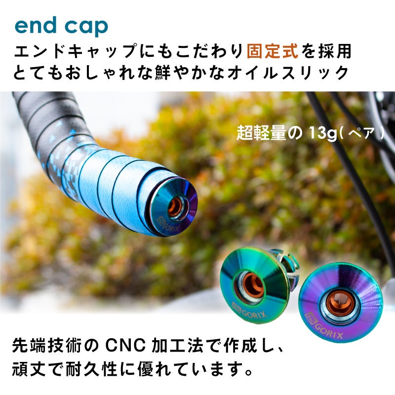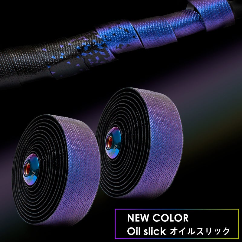 2色を使いデザイン性に優れたおしゃれなバーテープです。握り心地はモチモチスベスベで2mm厚なのでごつごつせず、オイルスリックカラーの固定式で紛失しにくいエンドキャップ付き。