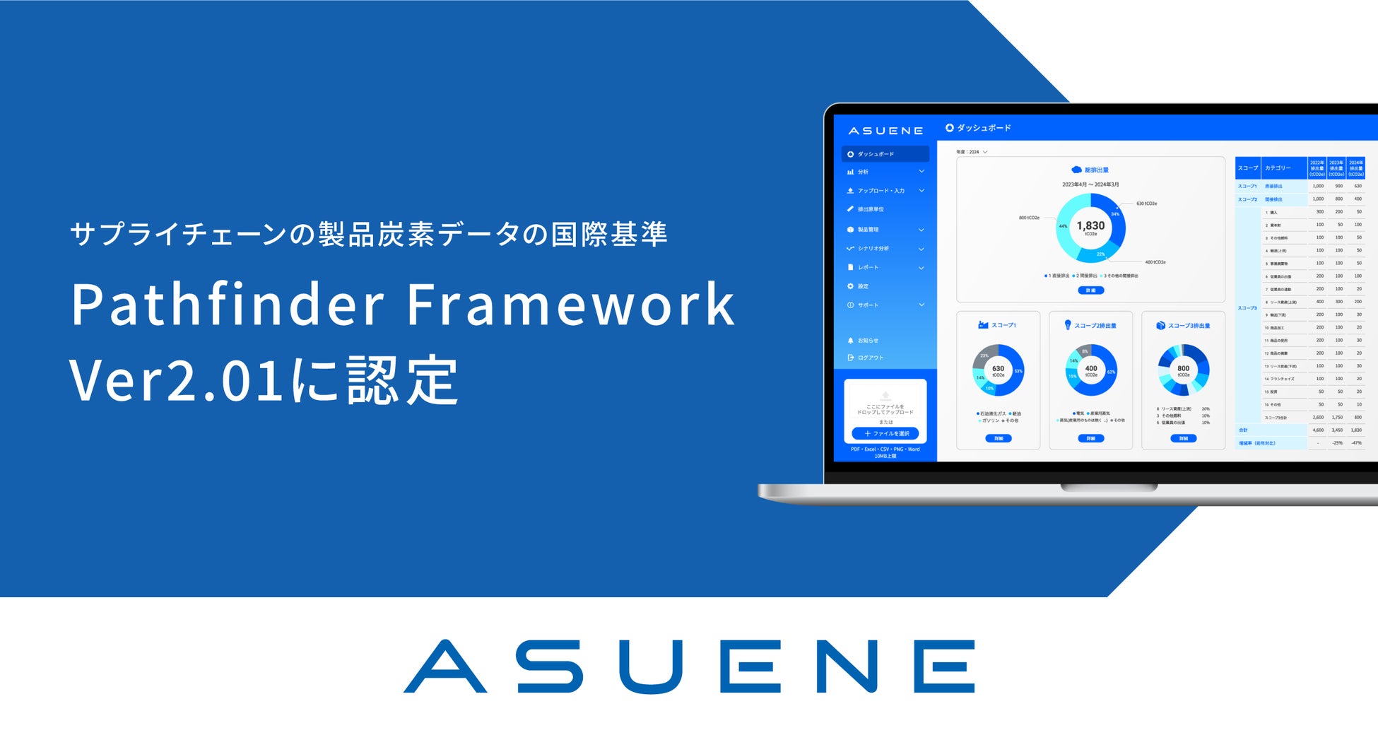 アスエネは、最新版の「Pathfinder Framework」への対応を通じて、「ASUENE」の導入企業のデータの透明性、正確性を担保する取り組みをさらに強化し、脱炭素社会の実現に貢献してまいります。