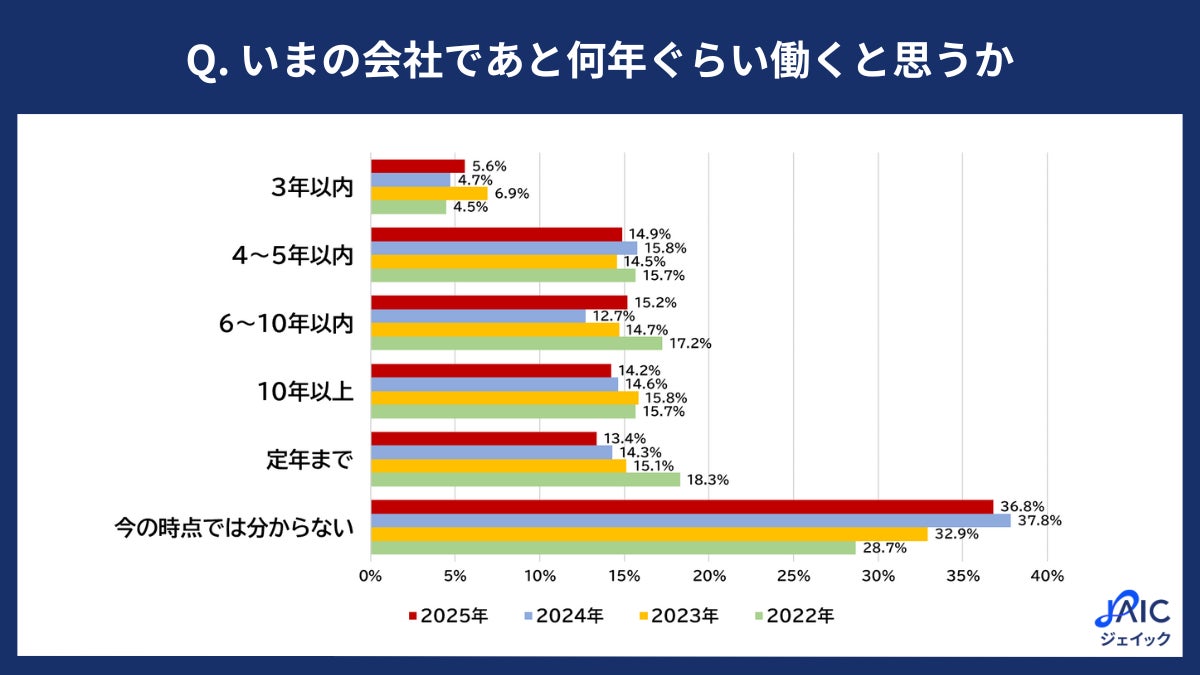 「いまの会社であと何年ぐらい働くと思うか、今時点であなたの考え方に近いものを1つ選択してください」と質問したところ、「今の時点では分からない」が36.8%、「6~10年以内」が15.2%、「4~5年以内」が14.9%、「10年以上」が14.2%、「定年まで」が13.4%、「3年以内」が5.6%となりました。