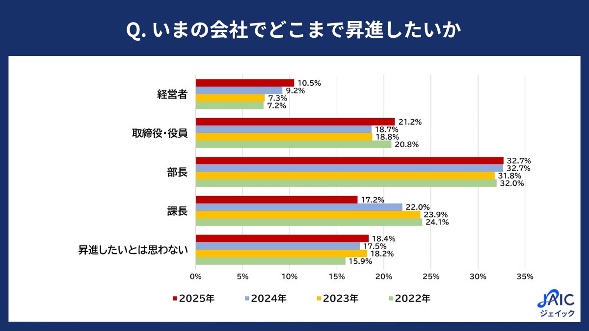 「いまの会社でどこまで昇進したいですか、1つ選択してください」と質問したところ、「部長」が32.7%、「取締役・役員」が21.2%、「昇進したいとは思わない」が18.4%、「課長」が17.2%、「経営者」が10.5%となりました。