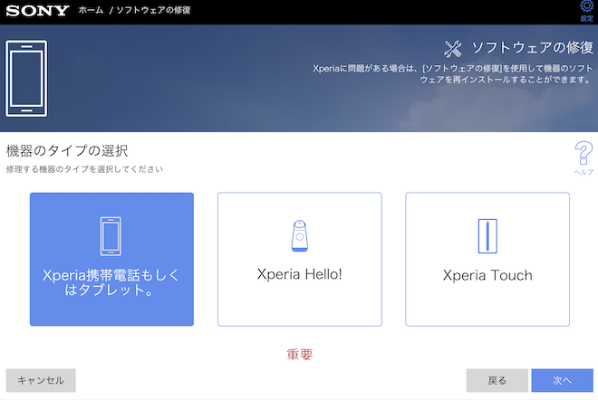 Step3:「Xperia携帯電話もしくはタブレット」を選んで「次へ」をクリックします。