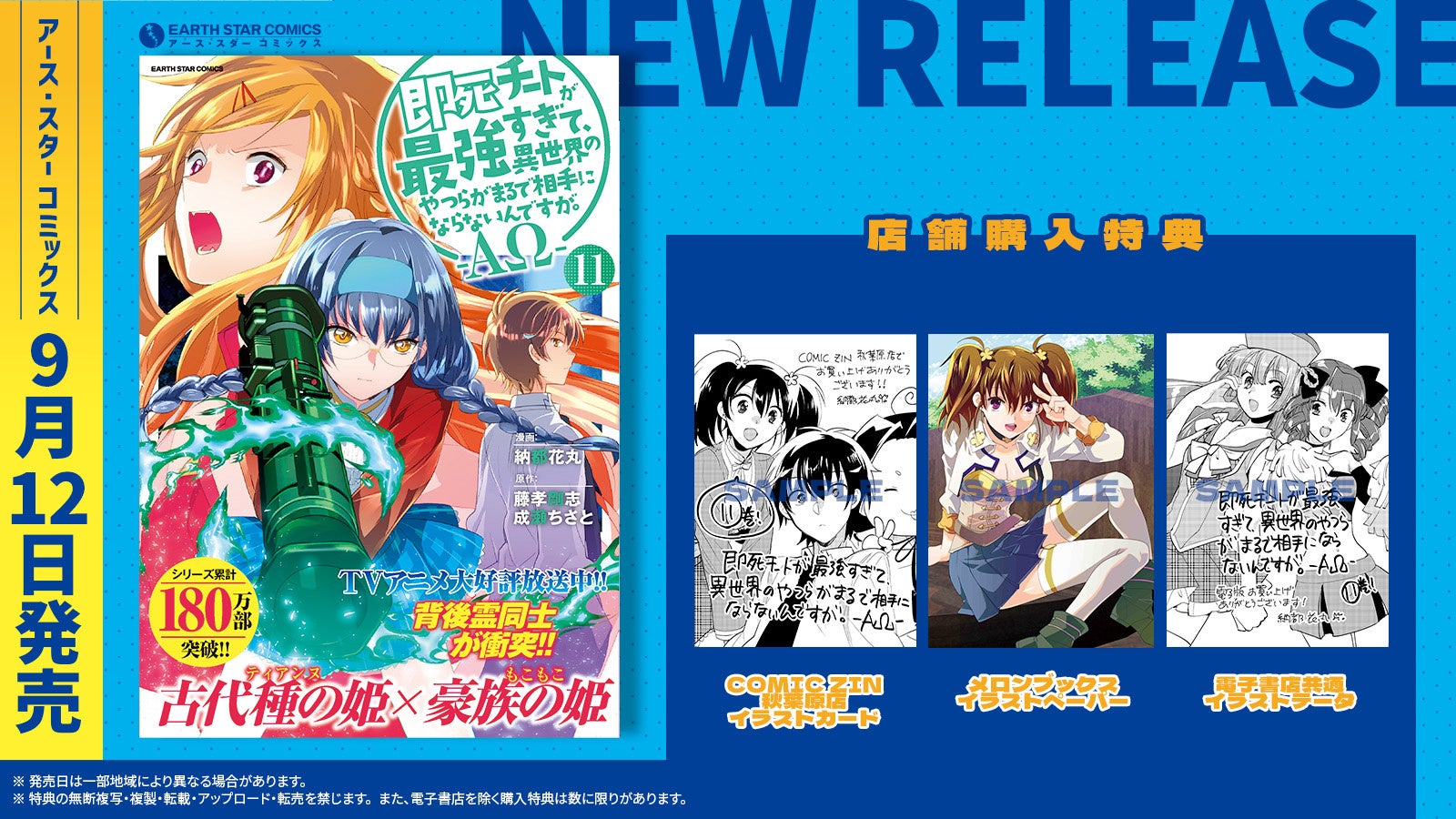 現在コミック アース・スター公式サイトにて連載中の人気作品『即死チートが最強すぎて、異世界のやつらがまるで相手にならないんですが。-ΑΩ-』第11巻(漫画:納都花丸 原作:藤孝剛志・成瀬ちさと)を9月12日(木)に発売いたします。
