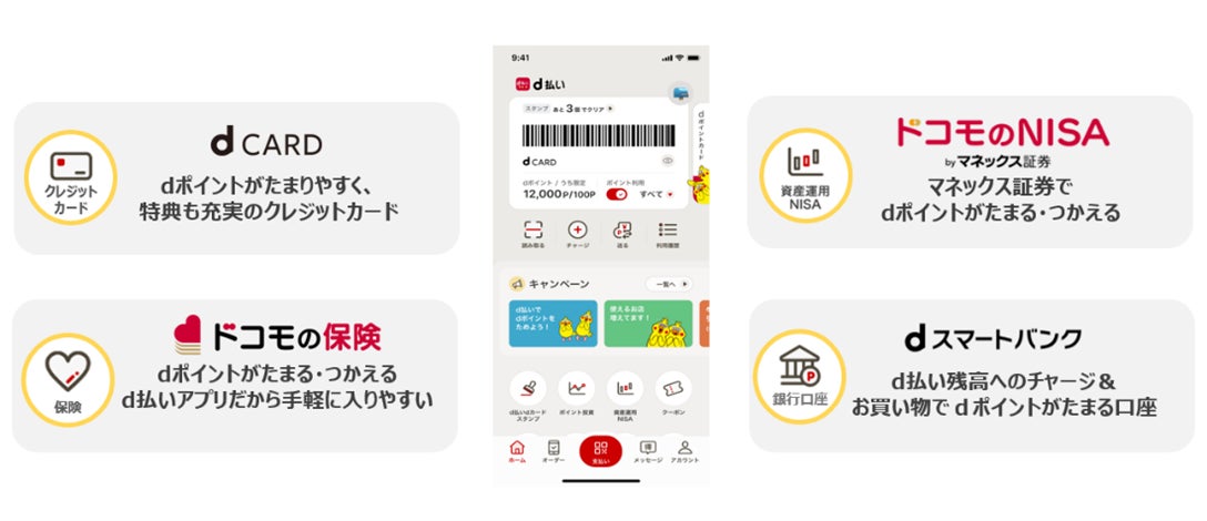 「d払い」では、保険サービスだけでなく、「ドコモのNISA by マネックス証券」「d スマートバンクTM」など、さまざまな金融サービスにアクセスできます。詳細は、「d払い」金融サービス紹介ページをご確認ください。