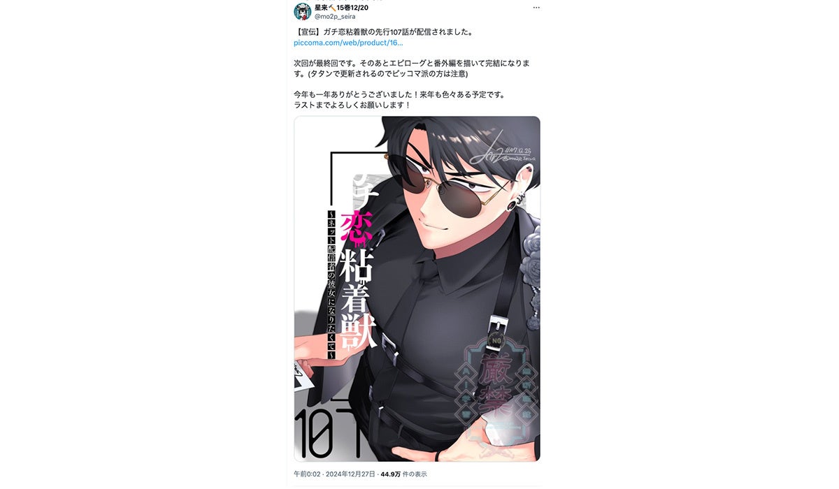 『ガチ恋粘着獣』第107話が先行配信 次回で最終回になることを作者・星来がSNSにて発表