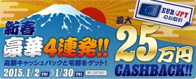 現在実施中の「豪華4連発!!新春キャンペーン」では「みんなのFX」において、ユーロ/円をお取引いただいたお客様に、取引高に応じて最大250,000円キャッシュバックいたします。