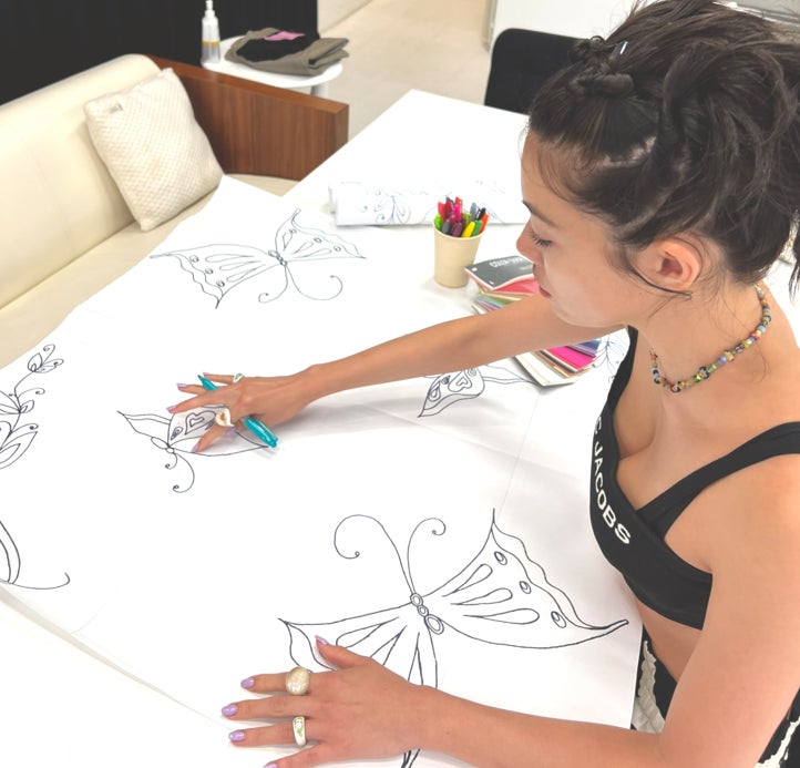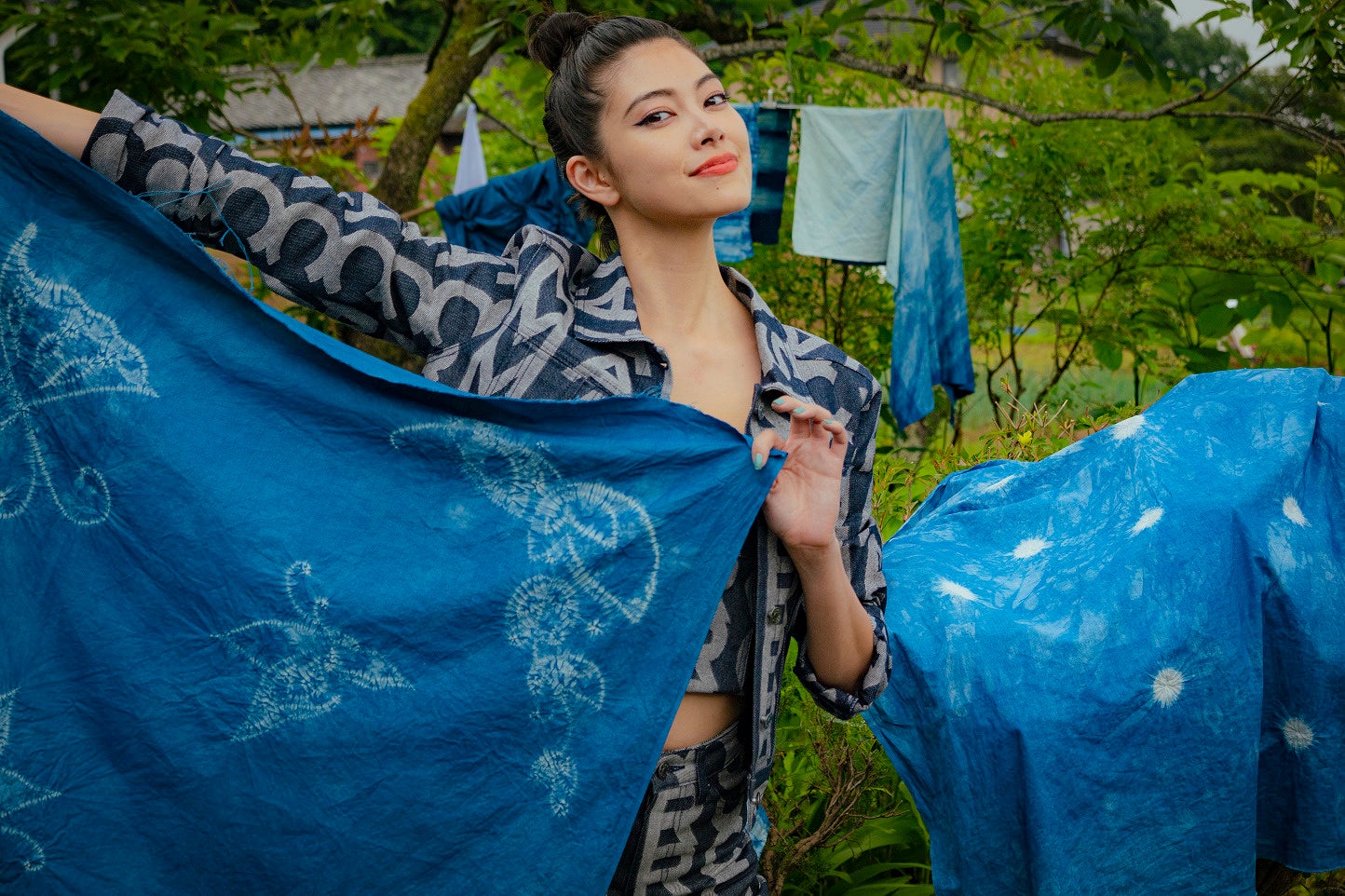 森星は「この度、私の大好きなブランドMARC JACOBSと共に、日本の伝統的な藍染を絞りの技法で表現した、特別なバンダナをデザインさせて頂きました。何かとスピードの早い現代、時間をかけてゆっくり発酵された藍という植物と、絞りのひとつずつを職人と作り上げた「染め」とのコラボレーションが織りなすデザインストーリーを、皆様にお届けします」と、その想いをクリエーションに落とし込んだ。