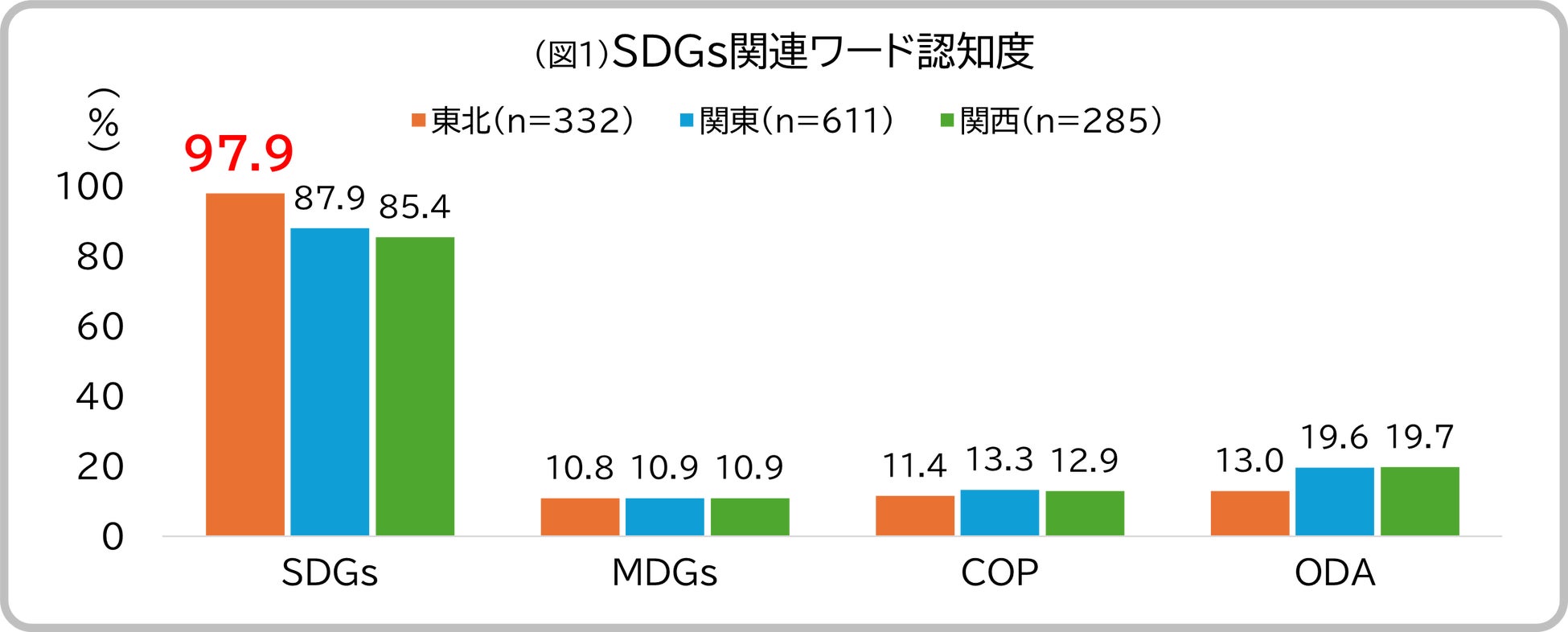「SDGsという言葉について知っているか」と聞いたところ、「知っている」と回答したのは東北97.9%、関東87.9%、関西85.4%となり、東北が最も高い結果となりました。