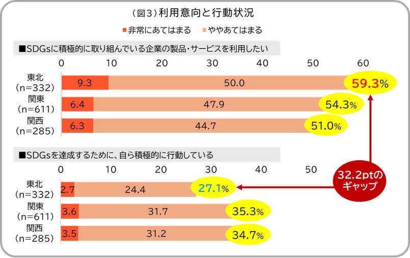 「SDGsに積極的に取り組んでいる企業の製品・サービスを利用したい(=利用意向)」にあてはまる(非常にあてはまる/あてはまる)かを聞いたところ、東北が59.3%、関東54.3%、関西51%となり、東北の学生が最も利用意向が高い結果となりました。一方、「SDGsを達成するために、自ら積極的に行動している」と回答した東北の学生は27.1%で、利用意向と比べると32.2ポイントの大きなギャップがあることが分かりました。(図3)