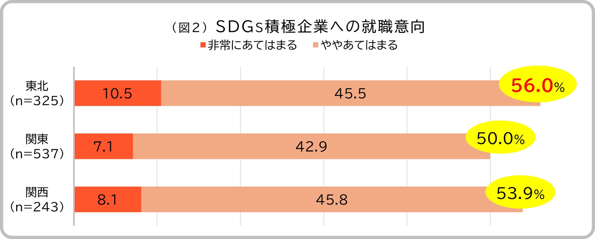また、「SDGsに積極的に取り組んでいる企業で働きたいか」という問いには、東北が56%、関西53.9%、関東50%が「あてはまる(非常にあてはまる/あてはまる)」と回答し、東北の学生には他地域の学生に比べて高い就職意向が見られました。これは、直面している震災復興や地域課題への取り組みを通じて、企業の社会的役割を実感してきた経験や、地元志向・エシカル消費といった価値観が背景にあると考えられます。(図2)