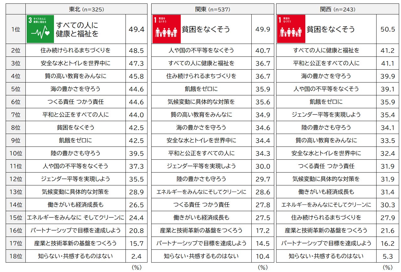 関東関西は「貧困をなくそう」、東北は「すべての人に健康と福祉を」