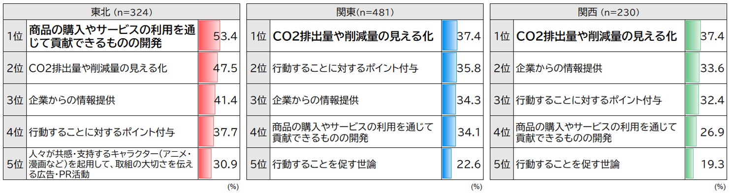 また、「SDGs実現に向けて行動を起こすために、企業はどのようなことをしたらいいと考えていますか」と聞いたところ、関東関西では1位が「CO2排出量や削減量の見える化」だったのに対し、東北では「貢献できる商品・サービスの開発」となりました。(図5)