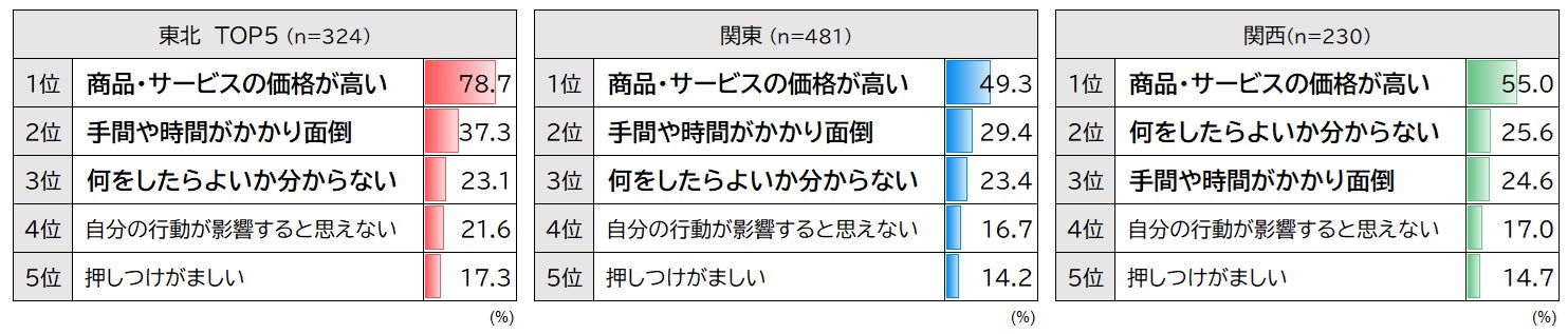 SDGs実現に向けた行動喚起や、商品購入をためらう原因のトップ3は、3地域学生共に