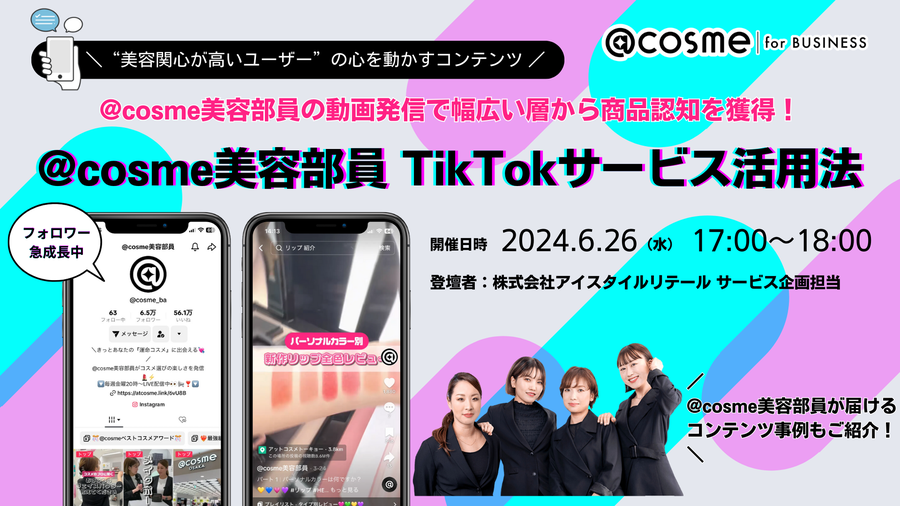 株式会社アイスタイル(代表取締役社長:遠藤 宗)は、2024年6月26日(水)に、ウェビナーイベント『@cosme美容部員の動画発信で幅広い層から商品認知を獲得 @cosme美容部員 TikTokサービス活用法』を開催することをお知らせいたします。