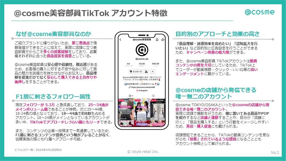 弊社でも2022年末から、「@cosme美容部員TikTok公式アカウント」(https://www.tiktok.com/@cosme_ba)を開設。各店舗の@cosme美容部員が第三者視点で様々な化粧品の魅力を届ける同アカウントのフォロワー数は6万人*1を超え、200万回を超える動画も複数配信するなど人気コンテンツとなっています。