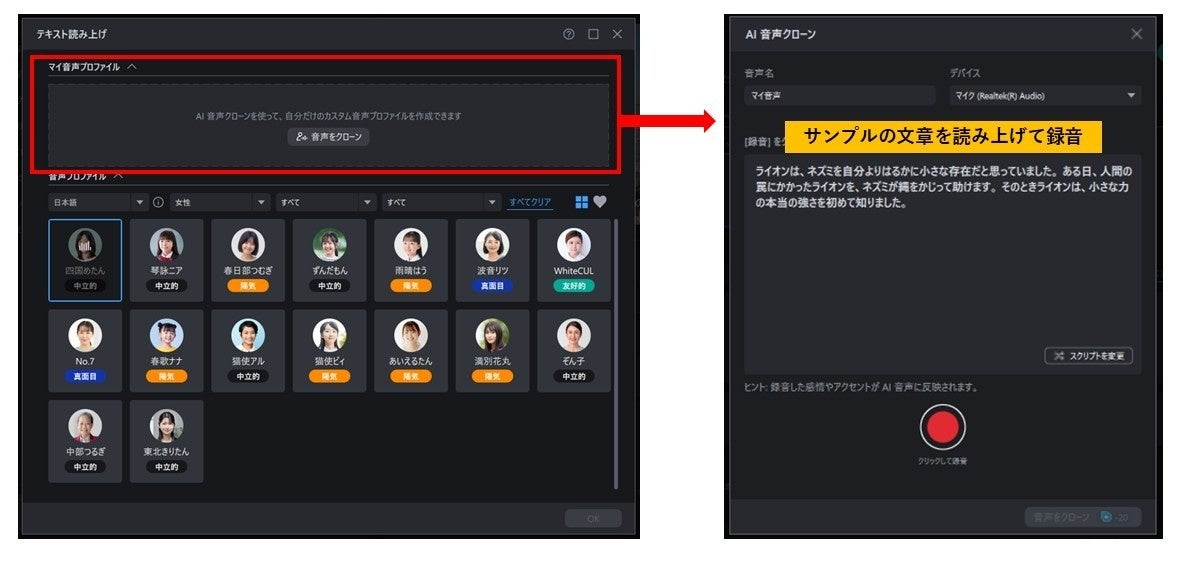 AI音声クローン機能は、録音した音声を音声プロファイルとして保存し、その声をもとにAIが音声を生成できる機能です。