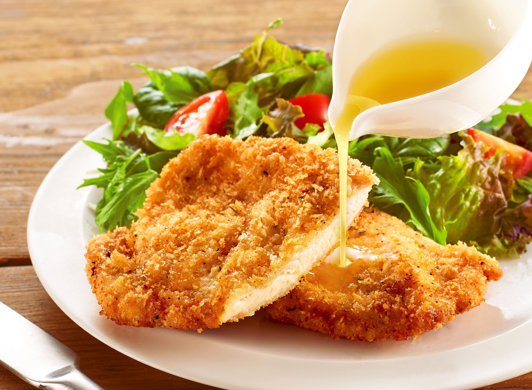 レモン果汁のさわやかな風味で、カツレツとつけあわせ野菜がさっぱりおいしく食べられます。