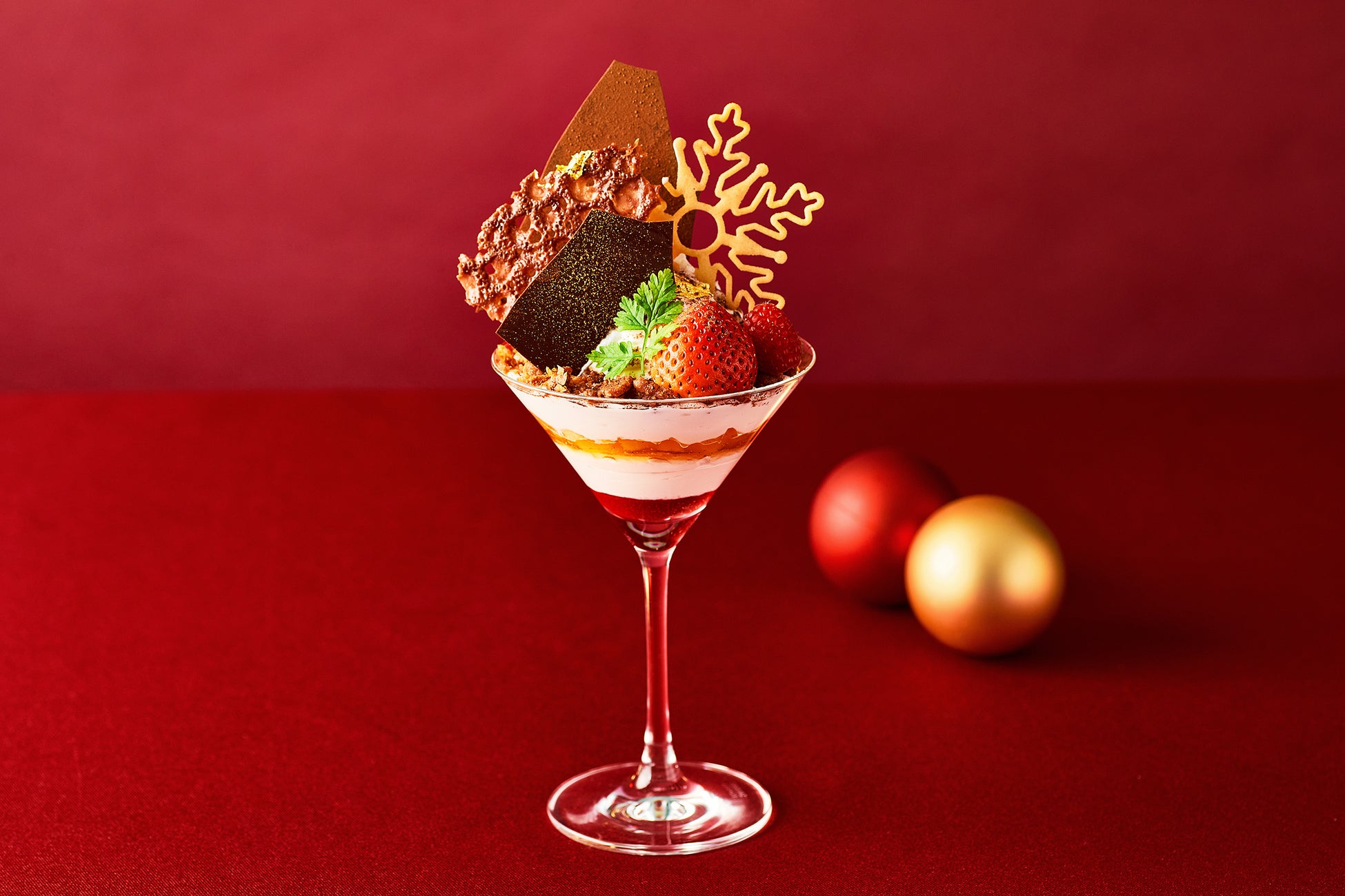 キャラメルアイスやマスカルポーネ、キャラメリゼした林檎、甘酸っぱいフランボソース、チョコクランブル等で層を作り、軽やかな甘さと酸味、食感をお楽しみいただけるパフェ。チョコレートや雪の結晶の飾りが、見た目にも華やかさをプラスする冬の贅沢な一品です。