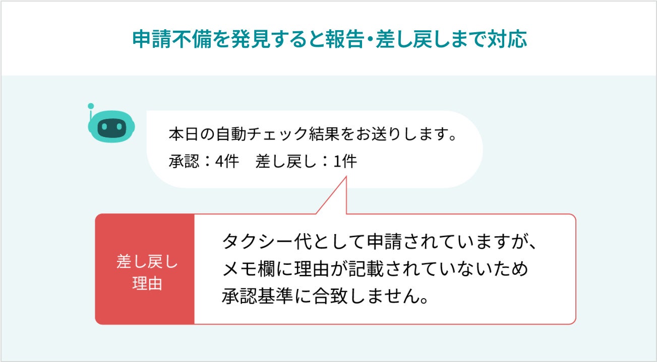 「TOKIUM AI経費承認」は、提出された立替経費の申請に規程違反や記載事項の入力漏れなどの不備がないかを確認した上で、一次承認を実行します。さらに、申請に不備があった場合には、該当箇所と理由を示した上で、申請者への差し戻しも代行します。