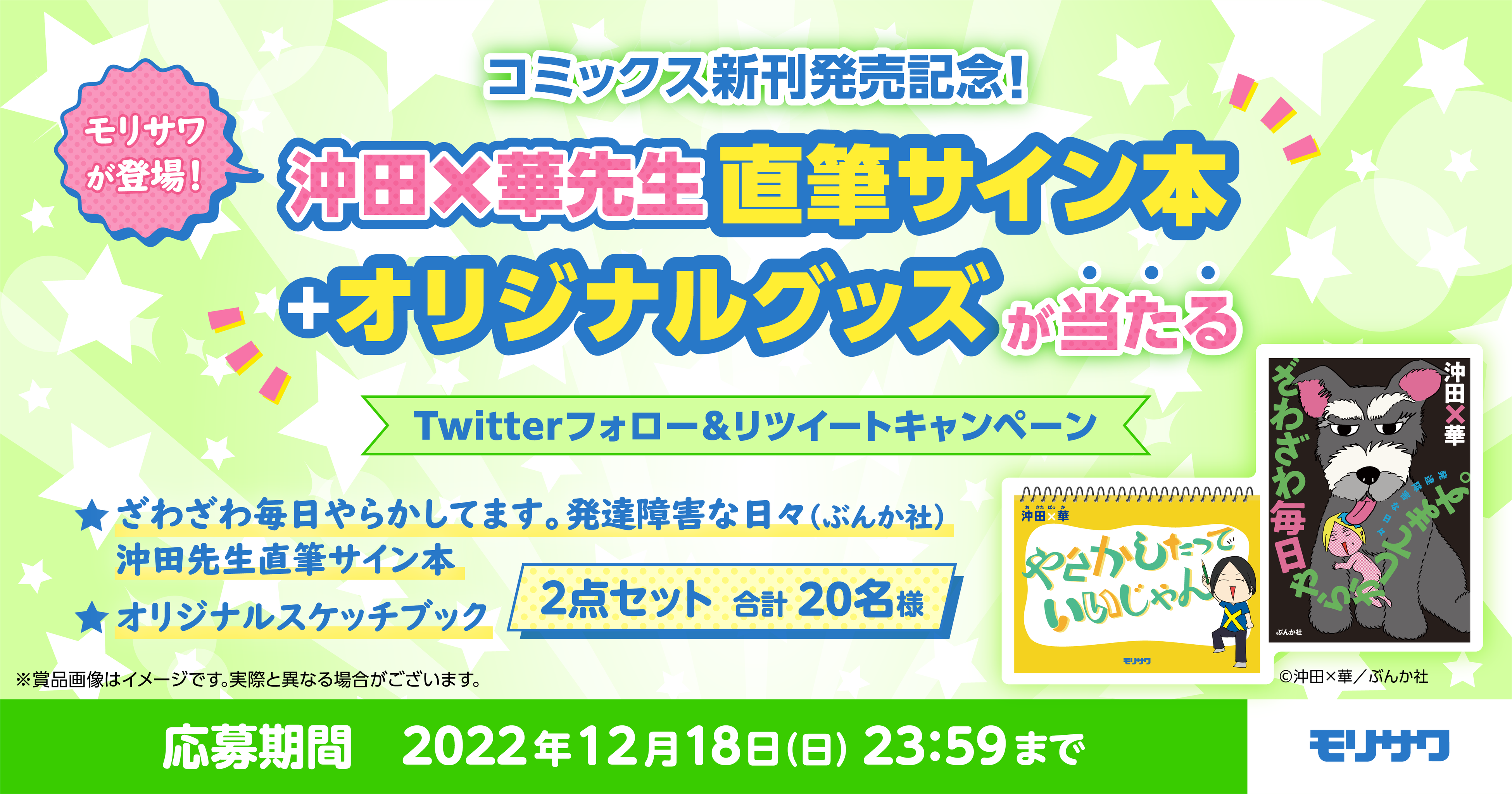 賞品および当選者数:直筆サイン入りコミックス『ざわざわ毎日やらかしてます。発達障害な日々(ぶんか社)』と沖田先生のイラストが入ったオリジナルスケッチブックのセット…20名様
