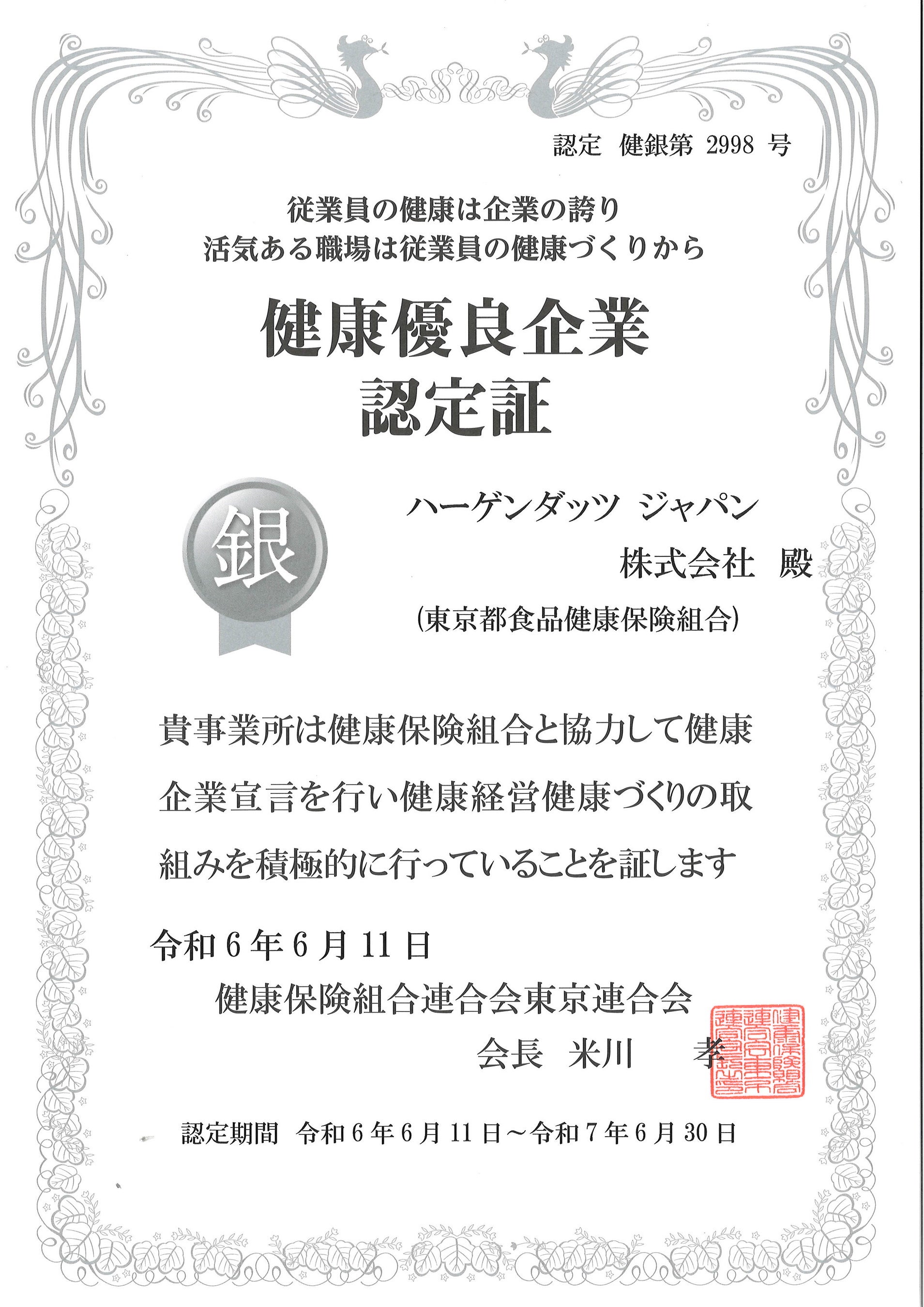 ハーゲンダッツ ジャパン株式会社(本社:東京都目黒区、社長:五十嵐享子)は、健康保険組合連合会 東京連合会が選定する健康優良企業として「銀の認定」を受けました。健康優良企業認定「銀の認定」は、企業全体で健康づくりに取り組むことを宣言し、一定の成果を上げた企業のみに認定される制度です。