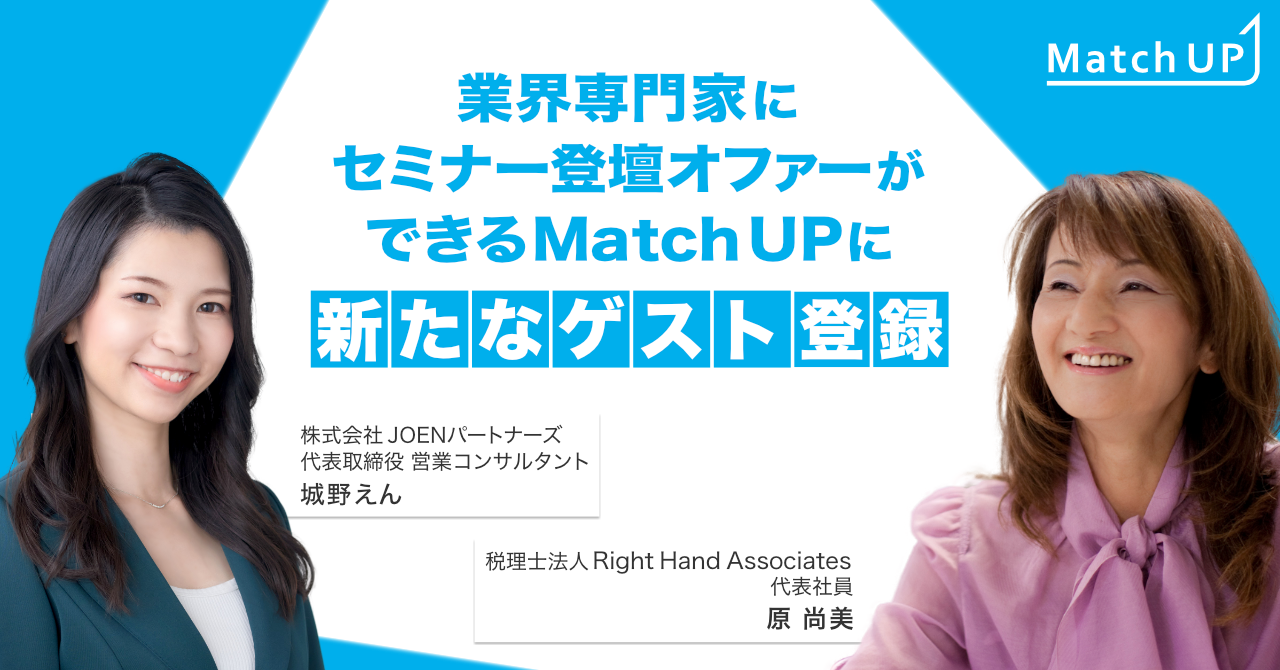 業界専門家にセミナー/イベント登壇のオファーができる「Match UP」株式会社JOENパートナーズの城野 えん氏、税理士法人Right Hand Associatesの原 尚美氏が新たにゲスト登録!