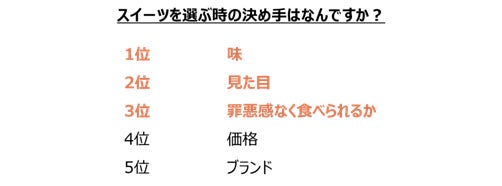 ◆スイーツ選びの決め手は「味」「見た目」に続いて、「罪悪感なく食べられるか」が3位にランクイン