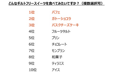 ◆「食べてみたいギルトフリースイーツ」第1位はスイーツ好きの定番「パフェ」!続いて、「ガトーショコラ」「バスクチーズケーキ」と濃厚な味わいが特徴のスイーツがランクイン。
