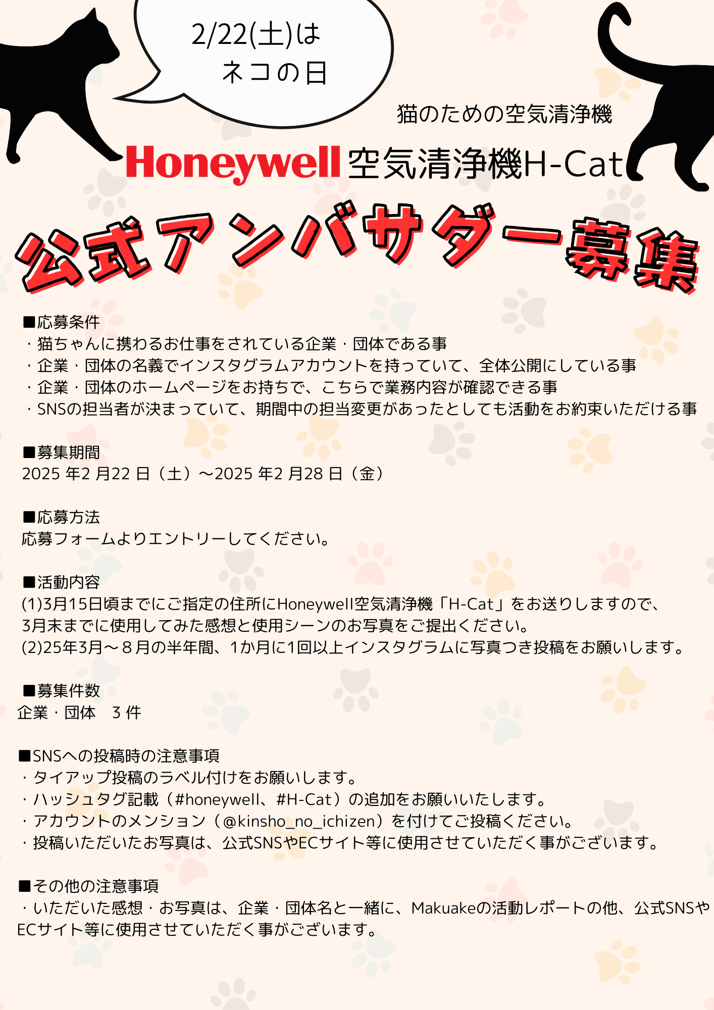 Honeywell空気清浄機「H-Cat」 公式アンバサダー 募集概要