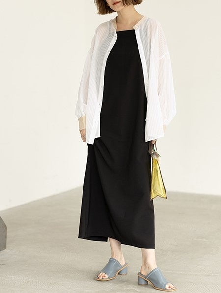 「バックフリルボリューム袖シアーシャツ」は、タックを入れたさり気ないボリュームスリーブに、バックのフリルとギャザーデザインによりトレンド感をプラスしたシャツアイテム。普段のファッションにさらっと一枚羽織るだけで、こなれ感を効かせたスタイリングが完成します。カラーは、コーディネートに合わせやすいブルーとブラックの2色展開。梅雨時期や夏場の冷房による冷え対策にも重宝する一着です。