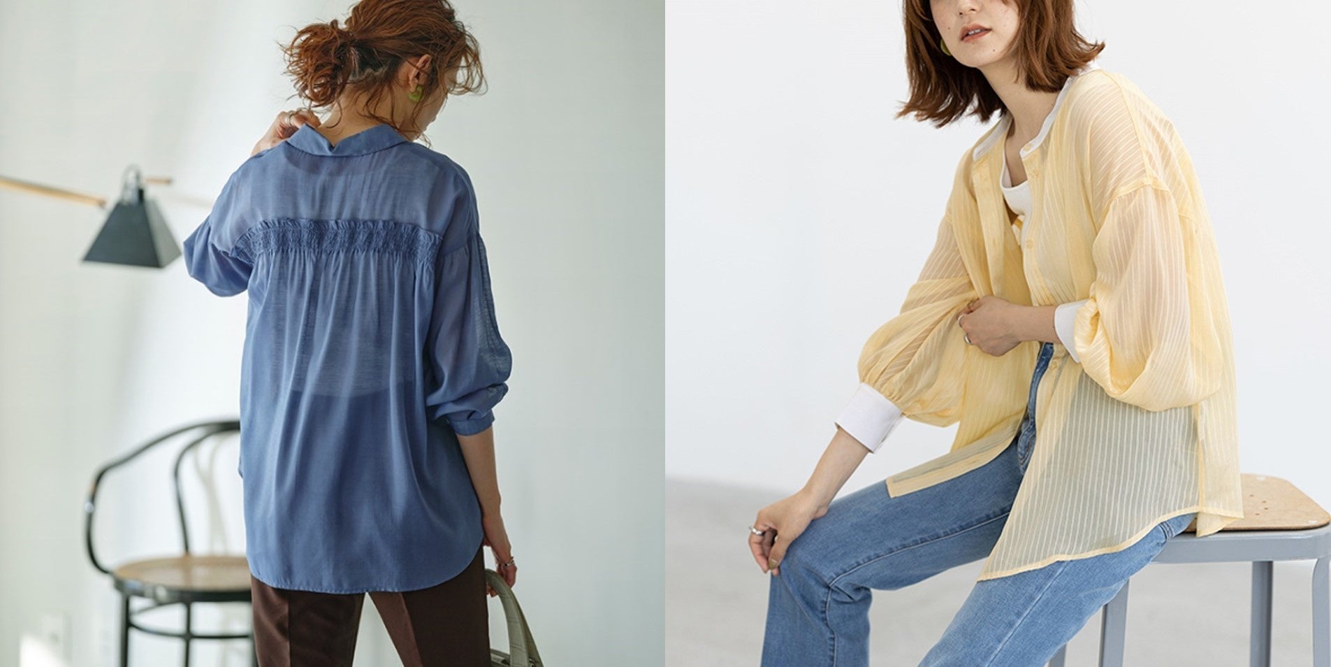 今回は、今シーズン人気のシアー素材にアクセントをプラスした、デザインシアーアイテムをピックアップ。バックフリルとギャザーデザインがおしゃれな「バックフリルボリューム袖シアーシャツ」、シアー×柄の配色が新しい「シアーストライプ配色シャツ」の2商品です。