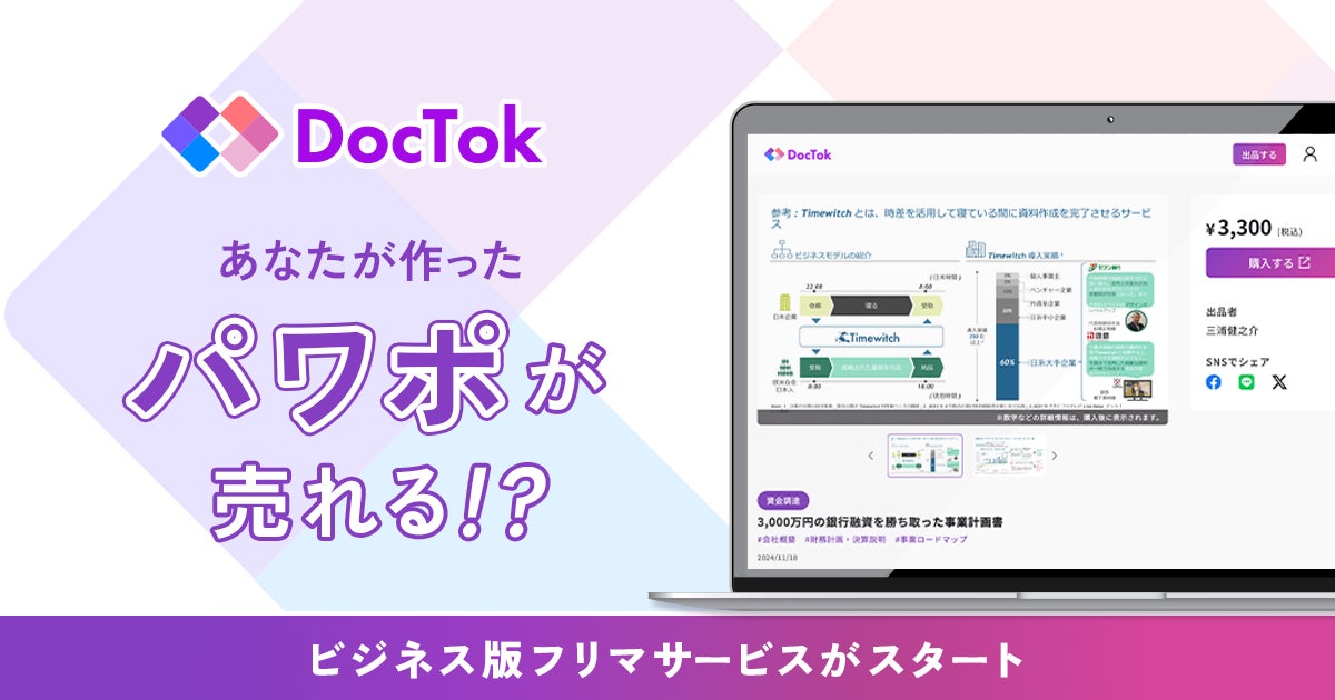 株式会社Relicホールディングス(本社:東京都渋谷区、代表取締役CEO:北嶋貴朗、以下、Relicホールディングス)のグループ会社である株式会社DocTok(本社:東京都渋谷区、代表取締役:岡田 崇)は、2024年12月25日(水)より、スライド・ドキュメントデータの出品/購入が可能なCtoCマーケットプレイス「DocTok」の本格提供を開始しました。