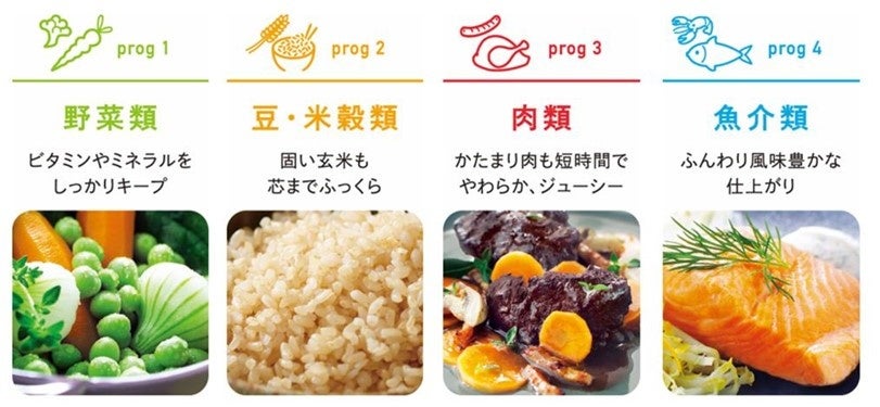 この度、同シリーズから新しく発売する「ティファールエクスペリエンス+圧力鍋4.5L」は、食材によって美味しく仕上がる調理時間と温度が異なる事に着目し、食材ごとに最適な圧力レベルを設定できるティファール独自の「4 つの調理プログラム」※を搭載。「野菜類」「豆・米穀類」「肉類」「魚介類」の「4つの調理プログラム」から、食材に合わせた圧力レベル設定することで、最適な圧力をかけ、より美味しく仕上げます。さらに、専用のタイマーが圧力鍋ならではの正確な火加減と調理時間の管理をサポートします。